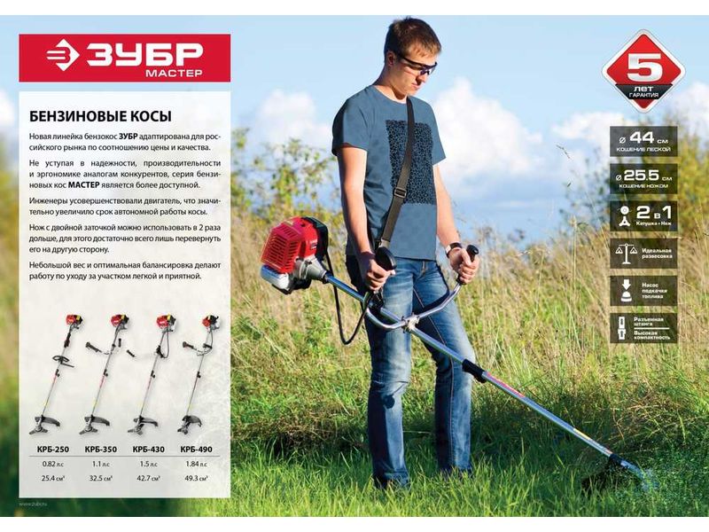 Коса ЗУБР МАСТЕР бензиновая, катушка с леской, 43 см3 (1,7 л.с. / 1,3 кВт), ширина кошения 44см, нож, ширина кошения 25,5см, 7500об/мин, топливный бак 1,2л