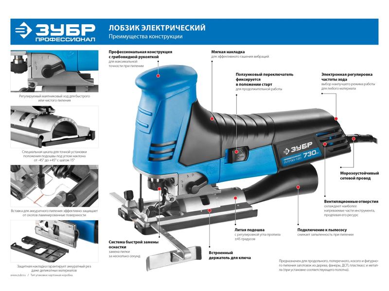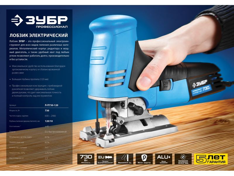 Лобзик «ЗУБР»для профессионалов для всех видов пиления различных материалов. Металлический корпус редуктора и мощный двигатель, а также удобный хват под любым углом подволяют работать долго, производительно и без усталости