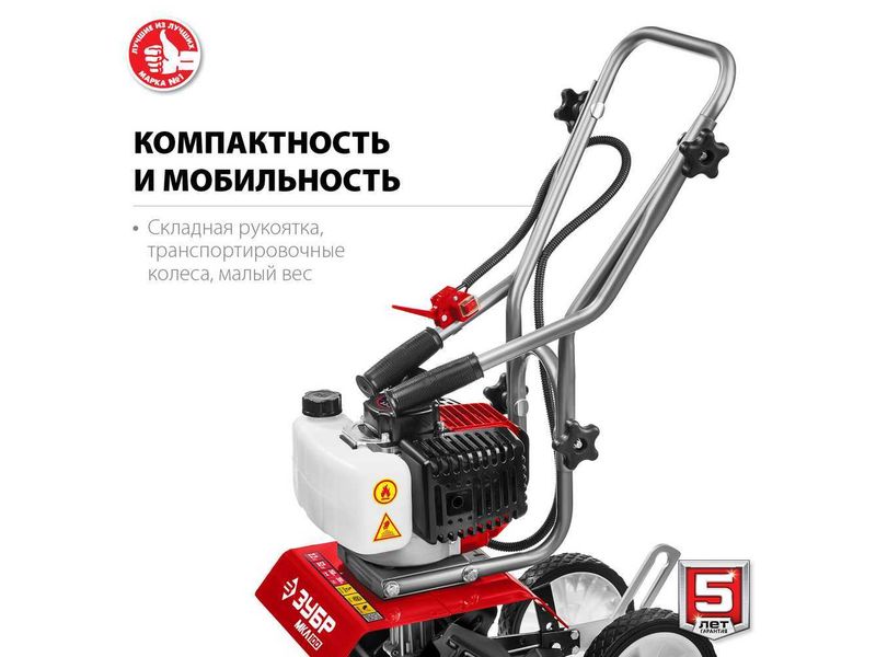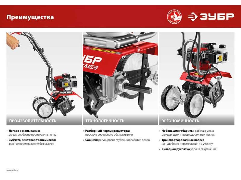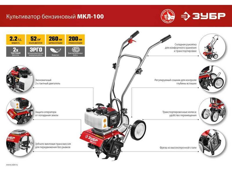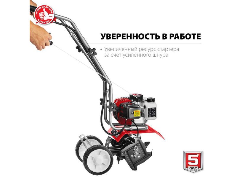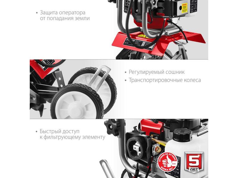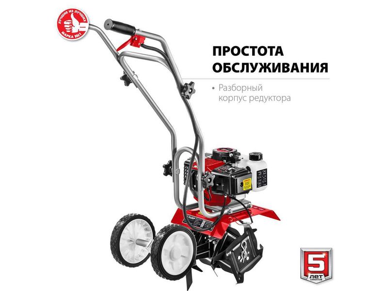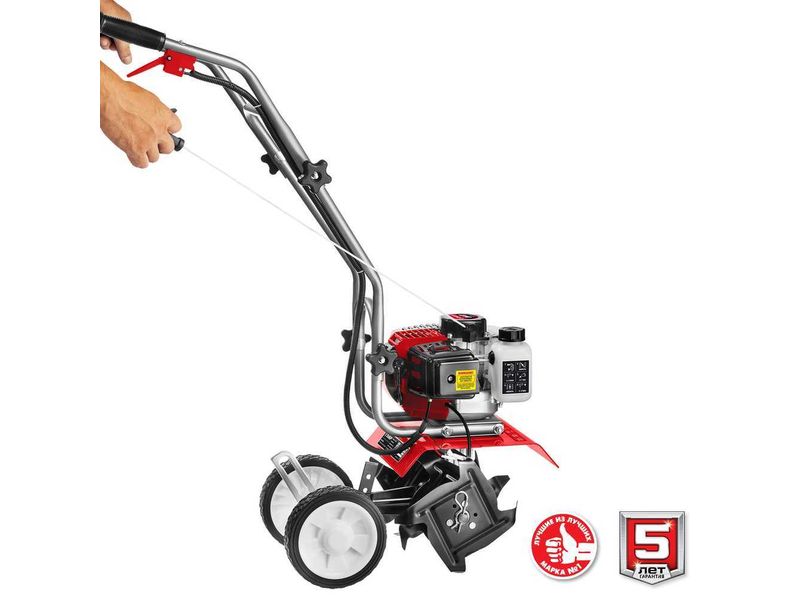Лёгкий и манёвренный культиватор с двухтактным двигателем для рыхления и культивации почвы на приусадебном участке. Сошник позволяет контролировать величину заглубления. Складная рукоятка и транспортные колеса облегчают эксплуатацию, транспортировку и хранение.