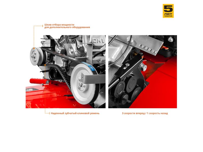 3 скорости вперед (понижающая, основная и повышающая) и 1 назад позволяют комфортно работать на любых типах почвы