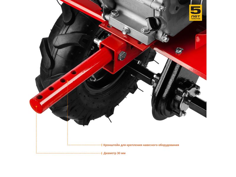 Кронштейн для крепления навесного оборудования (диаметр 30 мм) и шкив отбора мощности позволяют использовать широкую гамму навесного оборудования: снегоуборщик, щетку, роторную косилку