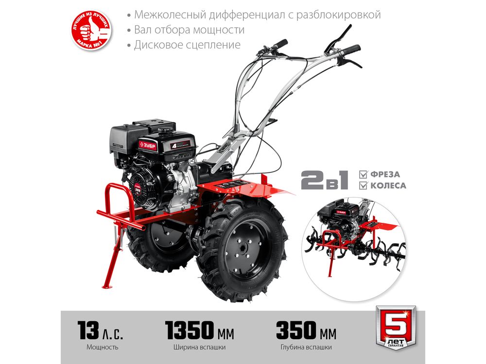 Мощный бензиновый мотоблок предназначен для рыхления и культивирования, а при использовании дополнительного навесного оборудования спектр применения мотоблока значительно расширится. Модель предлагает отличное сочетание высокой производительности, управляемости и устойчивости. В комплекте поставки входит 4 фрезы (2 правых и 2 левых) с увеличенной длиной, которые устанавливаются в непосредственной близости к редуктору и повернуты в его сторону. Увеличенная длина фрез используется для улучшения обработки почвы под редуктором. Сделано в России