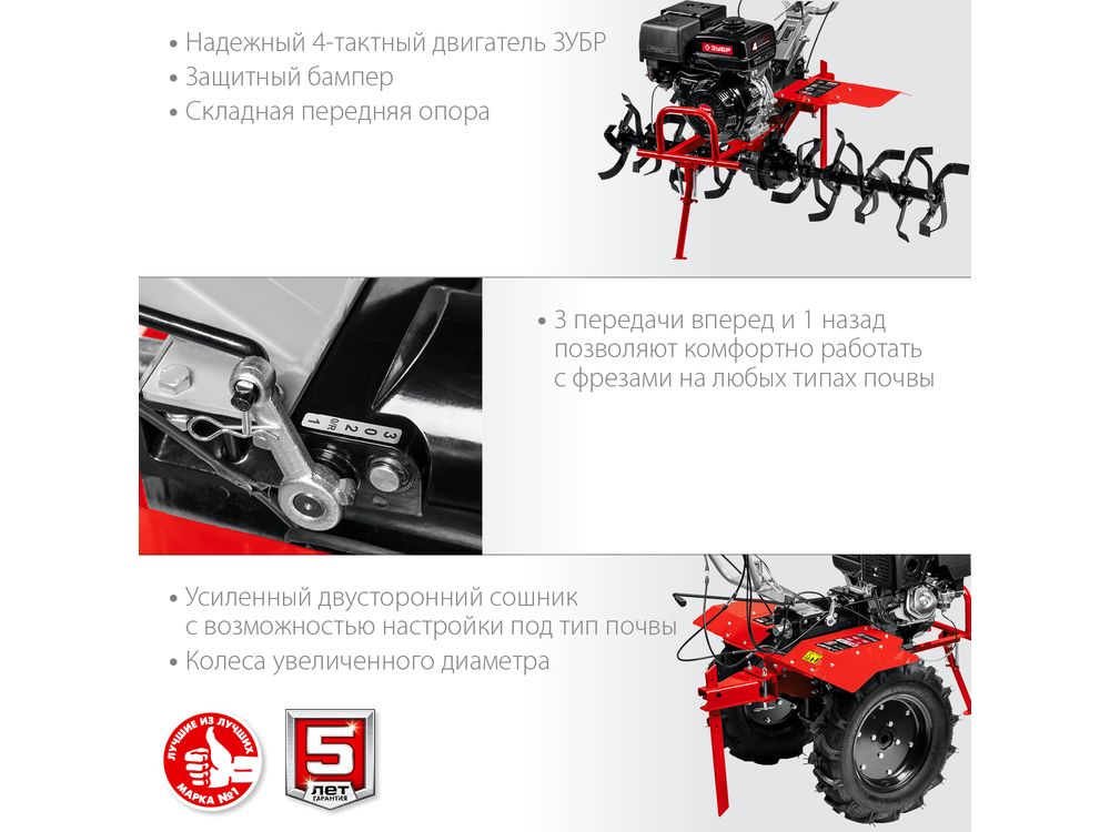 3 скорости вперед (понижающая, основная и повышающая) и 1 назад позволяют комфортно работать на любых типах почвы