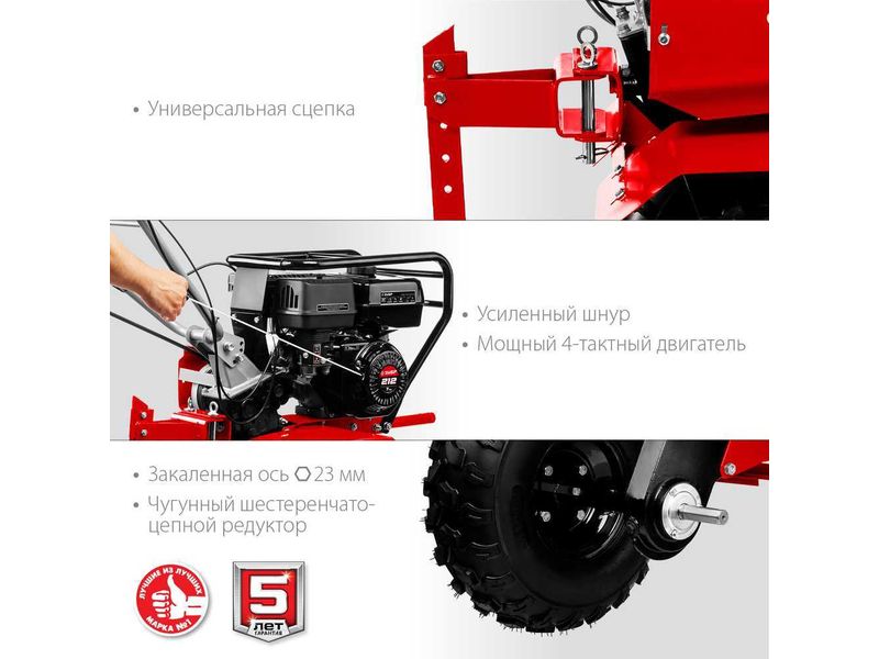 Надёжный и манёвренный мотоблок для рыхления и культивации почвы на приусадебном участке. Эффективный двигатель с воздушным фильтром в масляной ванне увеличивает моторесурс. Складываемые, регулируемые по положению рукоятки и транспортное колесо облегчают эксплуатацию, транспортировку и хранение. Сделано в России. Обратите внимание, что c 07.2021 сошник поставляется без транспортировочных колес