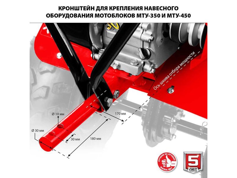 Кронштейн для крепления навесного оборудования (диаметр 30 мм) и шкив отбора мощности позволяют использовать широкую гамму навесного оборудования: снегоуборщик, щетку, роторную косилку