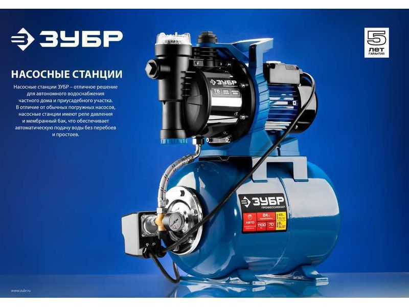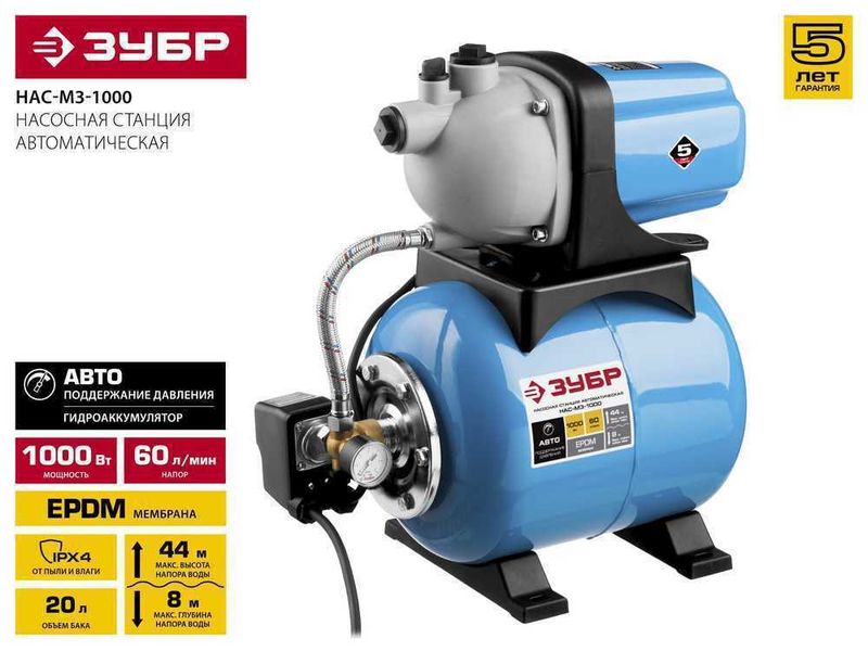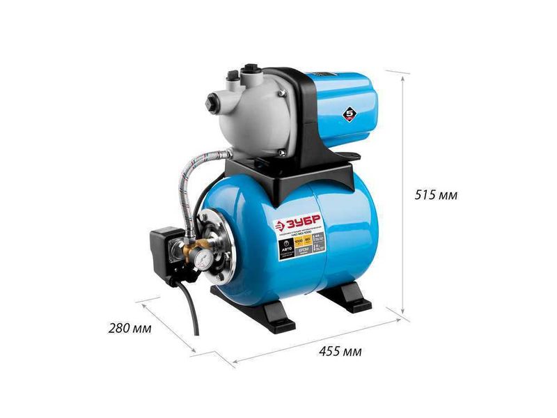 Станция насосная ЗУБР "МАСТЕР" М3 автоматическая, 1000 Вт, пропускная способность 60 л/мин, напор 44 м, бак 20 л