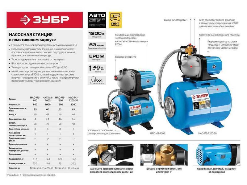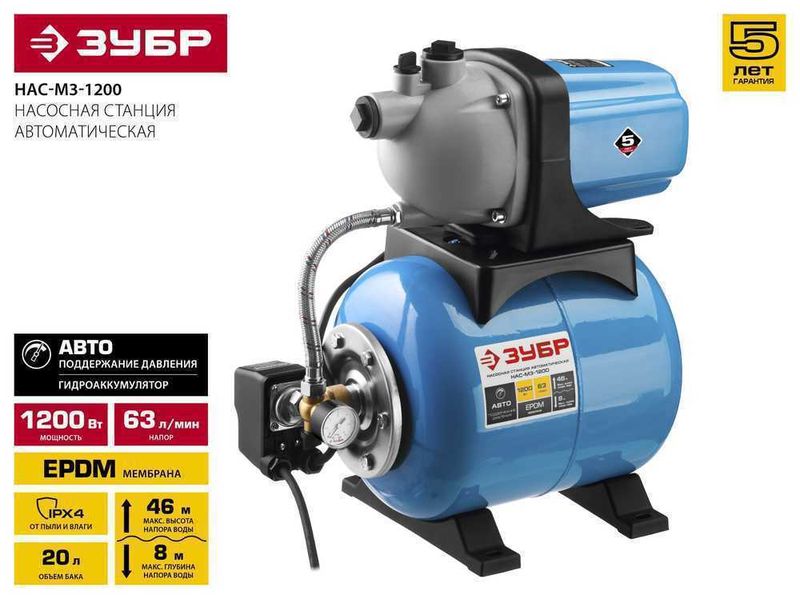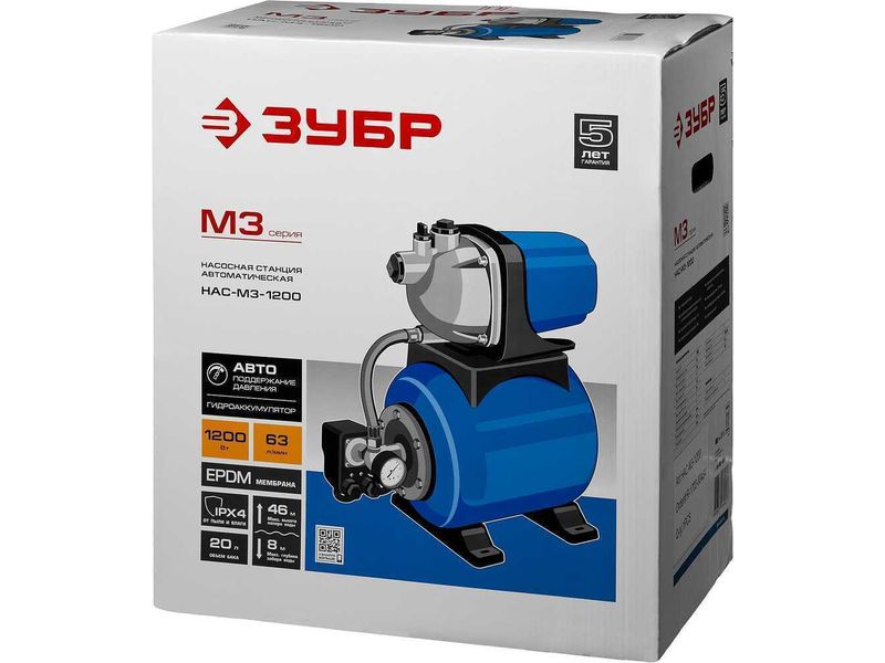 Станция насосная ЗУБР "МАСТЕР" М3 автоматическая, 1200 Вт, пропускная способность 63 л/мин, напор 46 м, бак 20 л