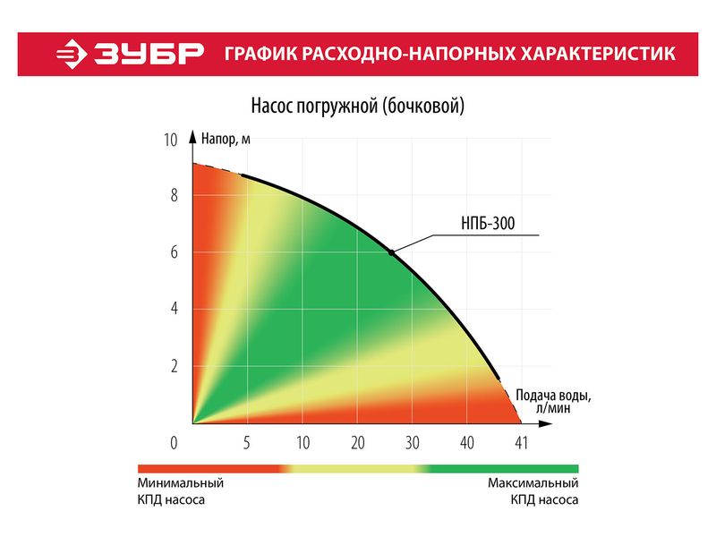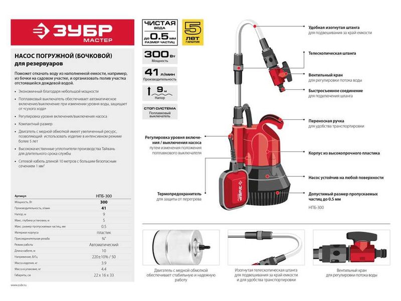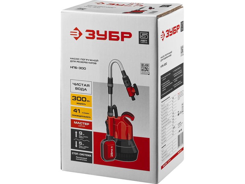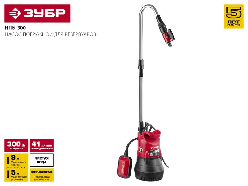 Насос ЗУБР погружной (бочковой), низкого давления , высота подачи воды 9м, 41л/мин, 300Вт