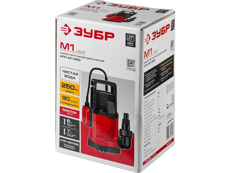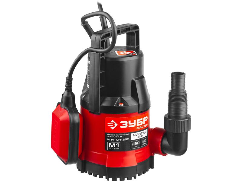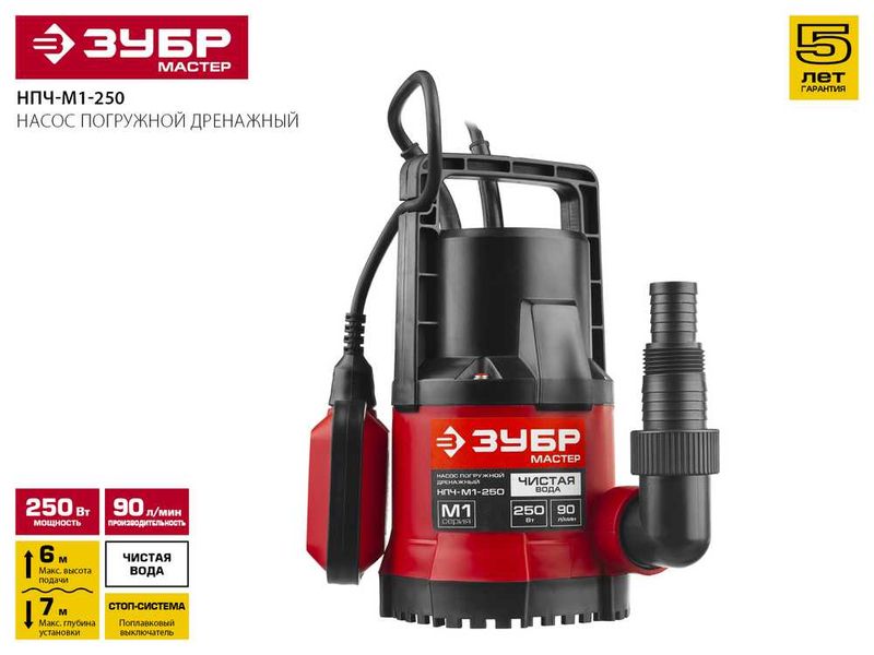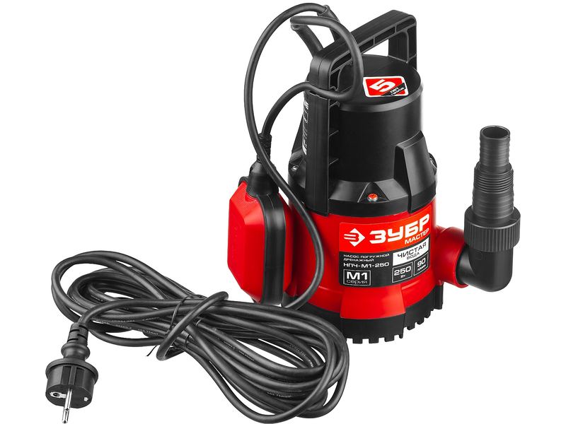 Насос ЗУБР МАСТЕР М1 погружной дренажный для чистой воды (диаметр частиц до 5 мм), 250Вт, пропускная способность 90 л/мин, напор 6,0 м