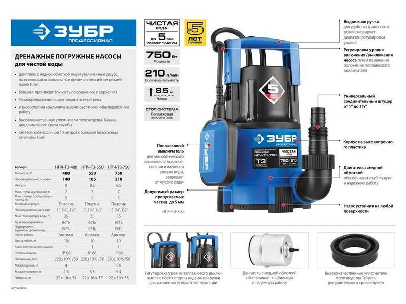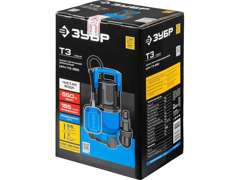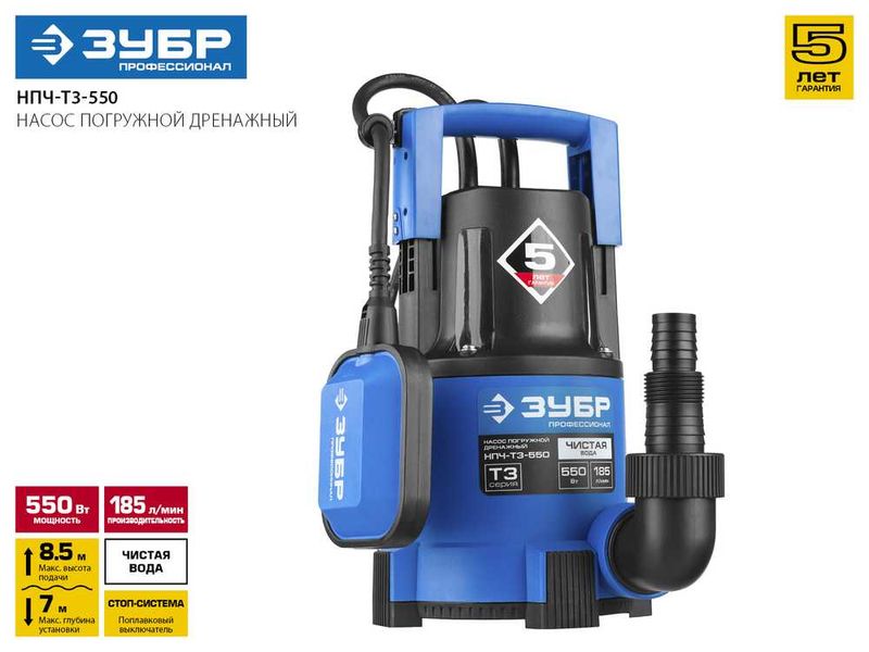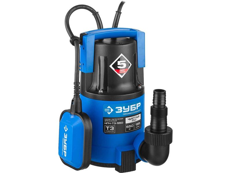 Насос ЗУБР ПРОФЕССИОНАЛ Т3 погружной дренажный для чистой воды (d пропускаемых частиц до 5мм), 550Вт, пропускная способность 185л/мин, напор 8,5м