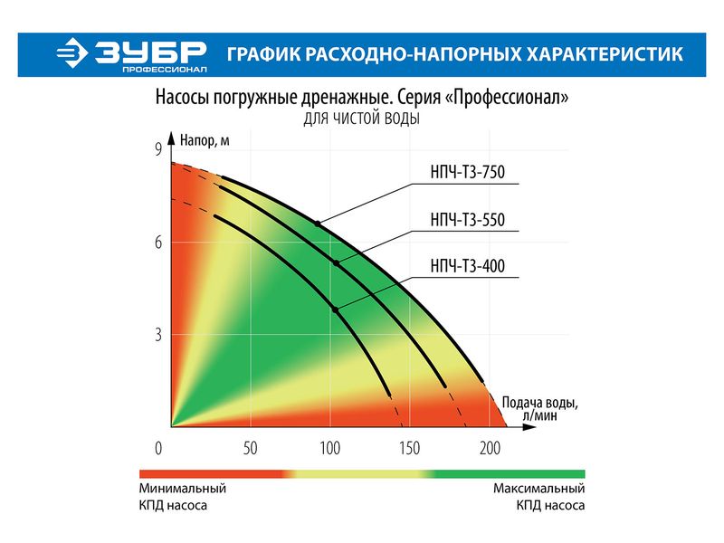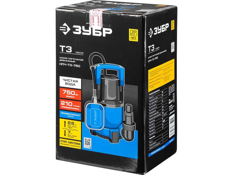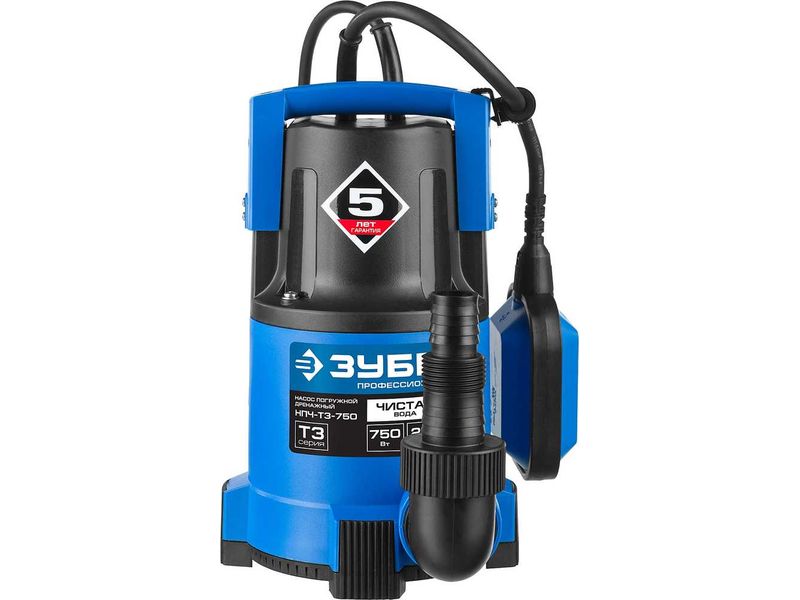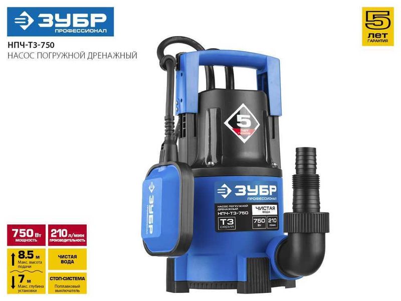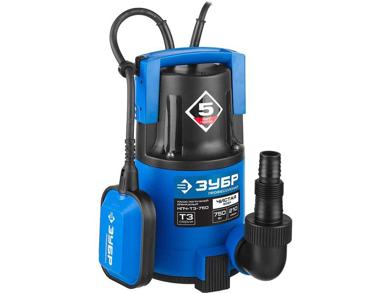 Насос ЗУБР ПРОФЕССИОНАЛ Т3 погружной дренажный для чистой воды (d пропускаемых частиц до 5мм), 750Вт, пропускная способность 210л/мин, напор 8,5м