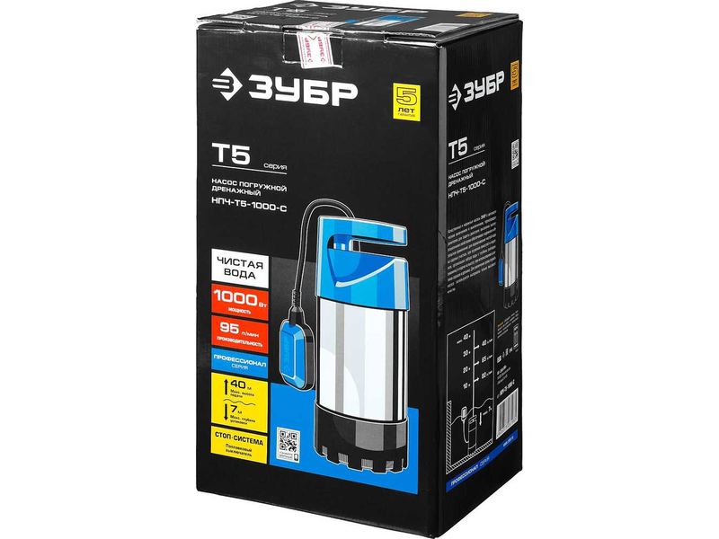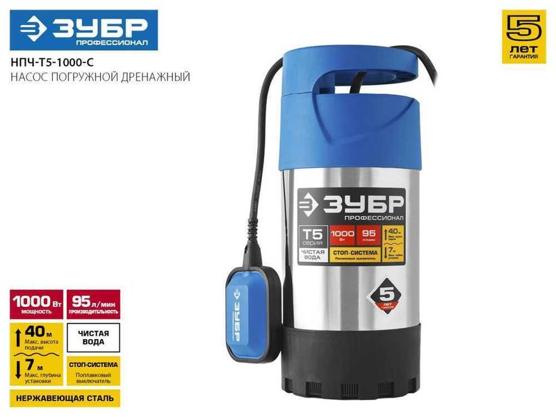 Насос ЗУБР ПРОФЕССИОНАЛ Т5 погружной дренажный для чистой воды (d пропуск частиц до 5мм), 1000Вт, нерж сталь, пропуск способн 95л/мин, напор 40м