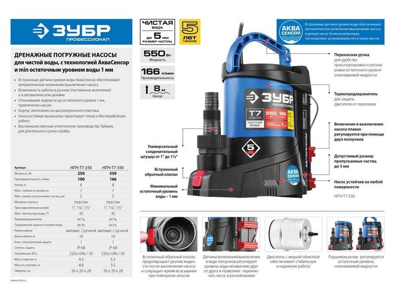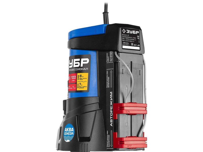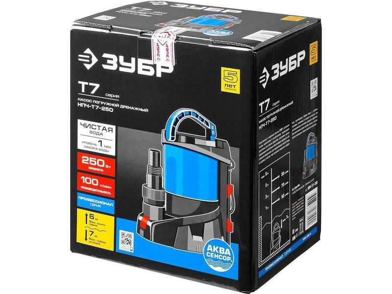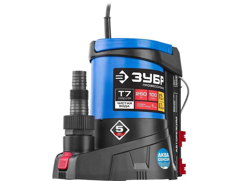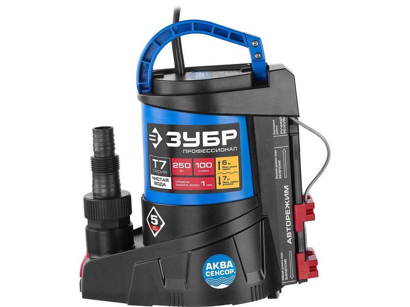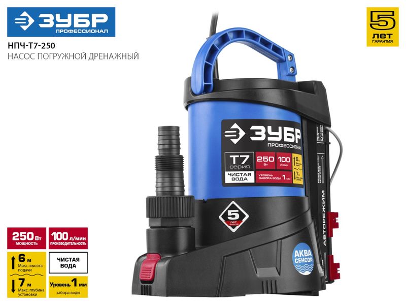 Насос ЗУБР ПРОФЕССИОНАЛ Т7 АкваСенсор погружной дренажный для чистой воды, 250Вт,мин. уровень 1мм, пропускная способность 100л/мин, напор 6,0м