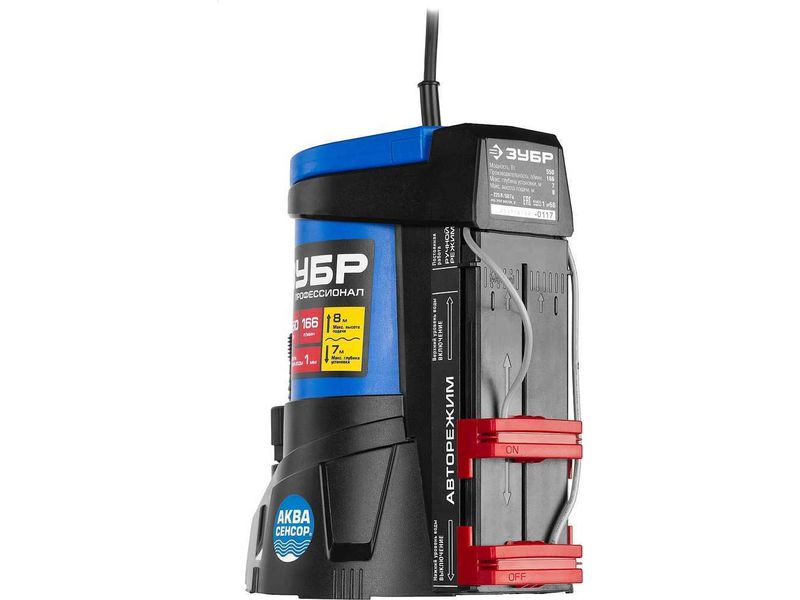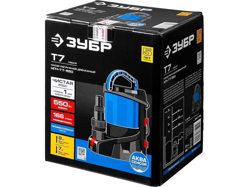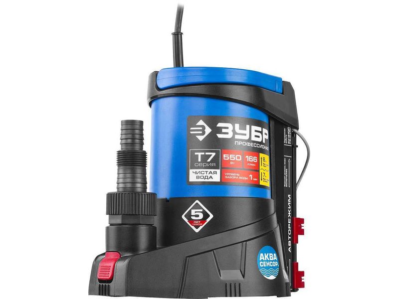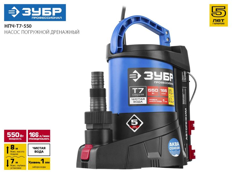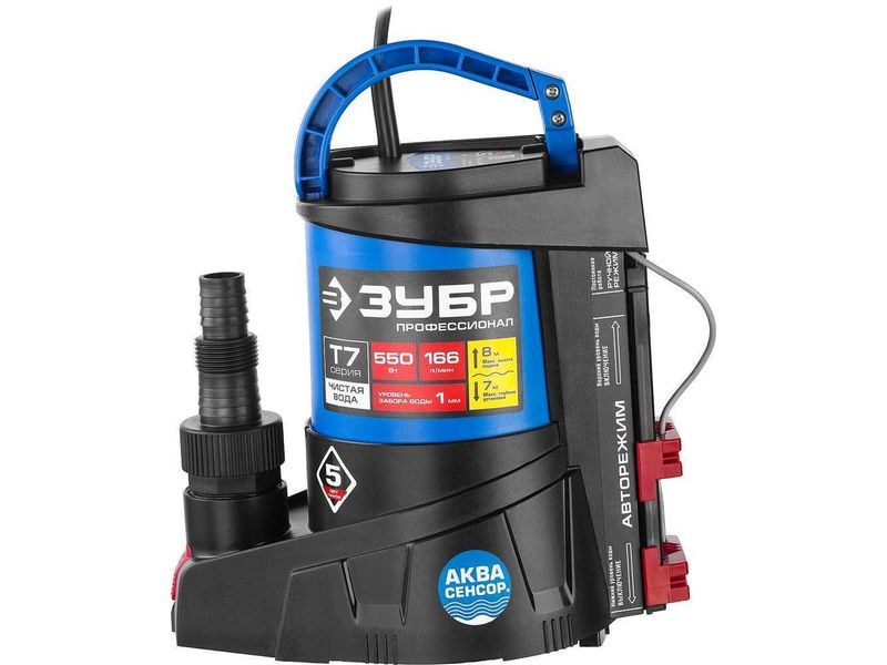 Насос ЗУБР ПРОФЕССИОНАЛ Т7 АкваСенсор погружной дренажный для чистой воды, 550Вт,мин. уровень 1мм, пропускная способность 166л/мин, напор 8,0м