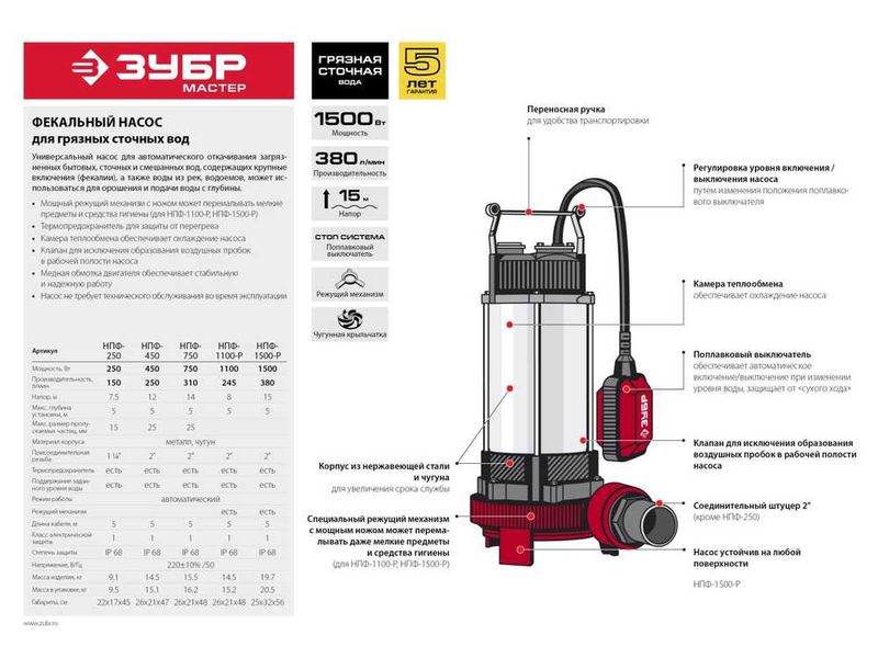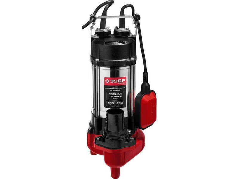 Купить Насос ЗУБР фекальный погружной, 450 Вт, пропускная способность 250 л/мин, напор 12 м, чугунный корпус,с поплавком