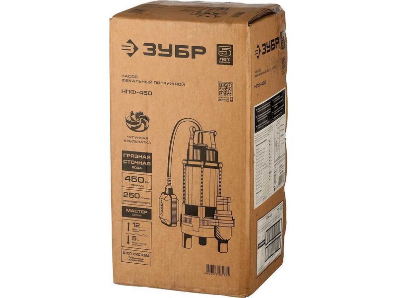 Насос ЗУБР фекальный погружной, 450 Вт, пропускная способность 250 л/мин, напор 12 м, чугунный корпус,с поплавком