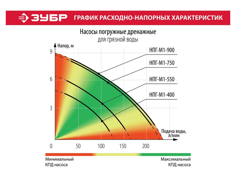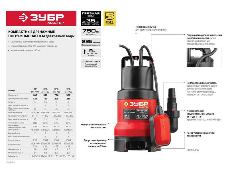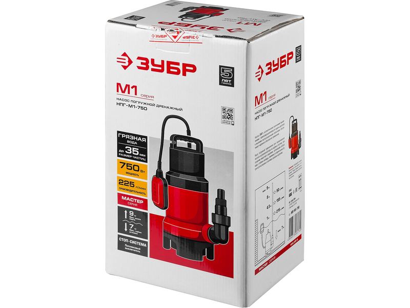 Насос ЗУБР МАСТЕР М1 погружной дренажный для грязной воды (d частиц до 35 мм), 750 Вт, пропускная способность 225 л/мин, напор 9,0 м, с поплавком