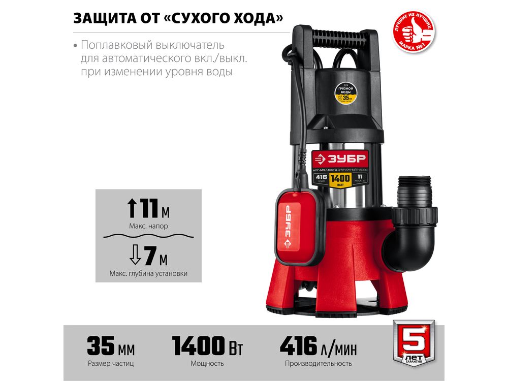 ЗУБР НПГ-М3-1400-С, дренажный насос для грязной воды, корпус - нерж. сталь, 1400 Вт