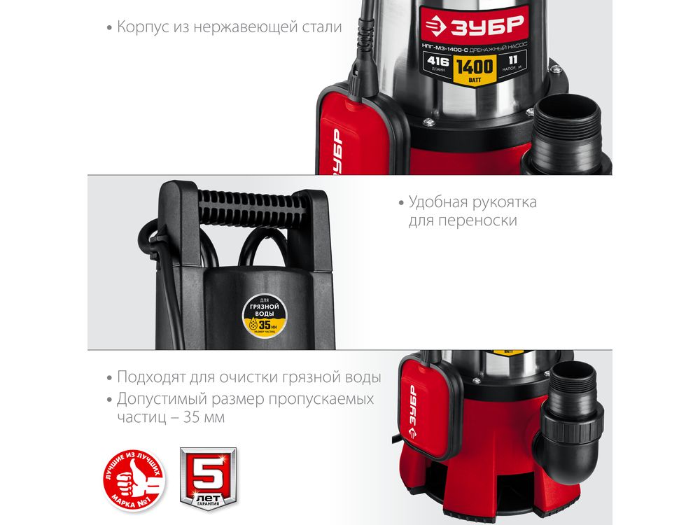 Купить ЗУБР НПГ-М3-1400-С, дренажный насос для грязной воды, корпус - нерж. сталь, 1400 Вт