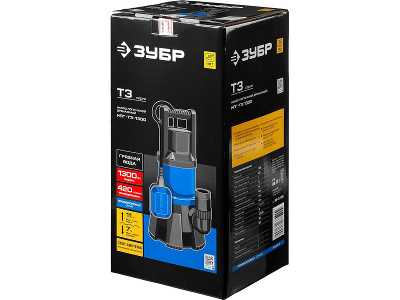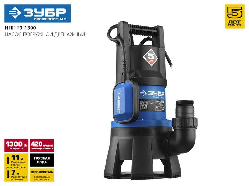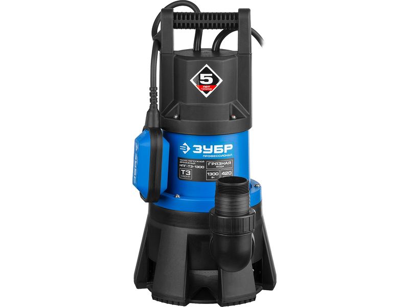 Насос ЗУБР ПРОФЕССИОНАЛ Т3 погружной дренажный для грязной воды (d пропуск частиц до 35мм), 1300Вт, пропуск способн 420л/мин, напор 11,0м, поплавок