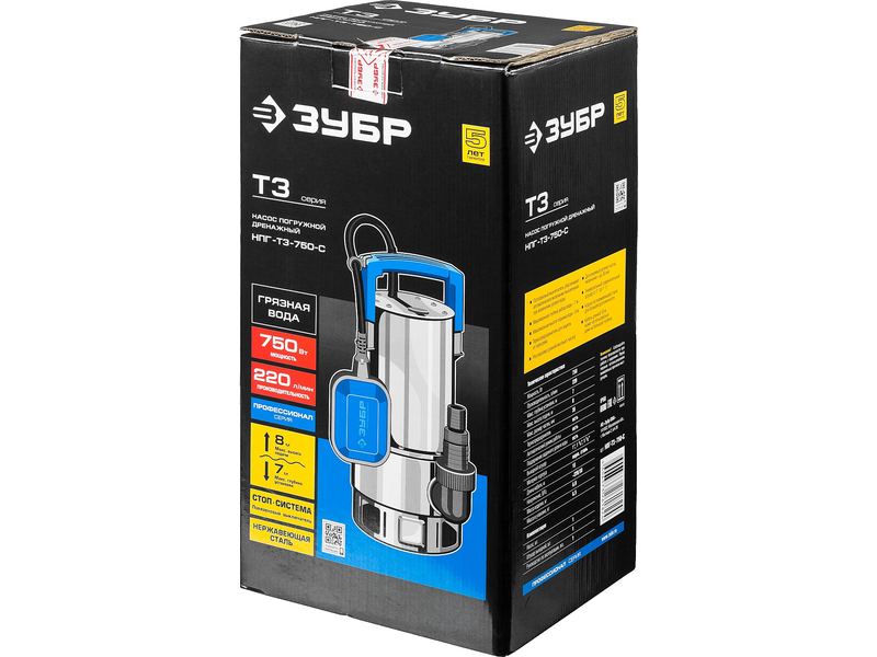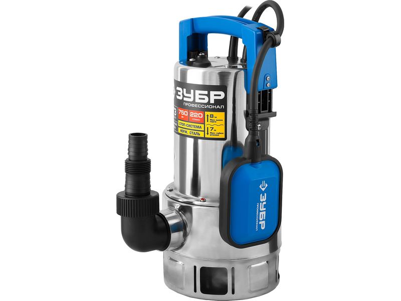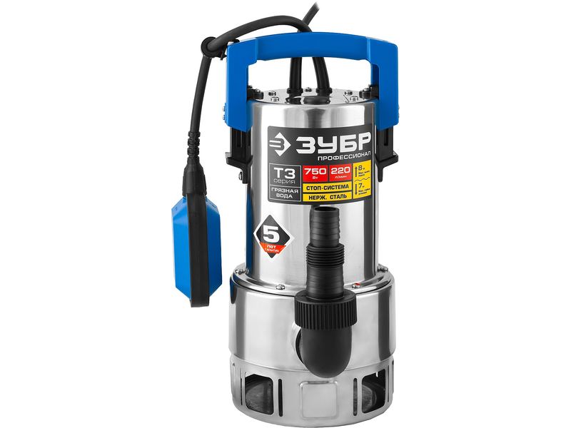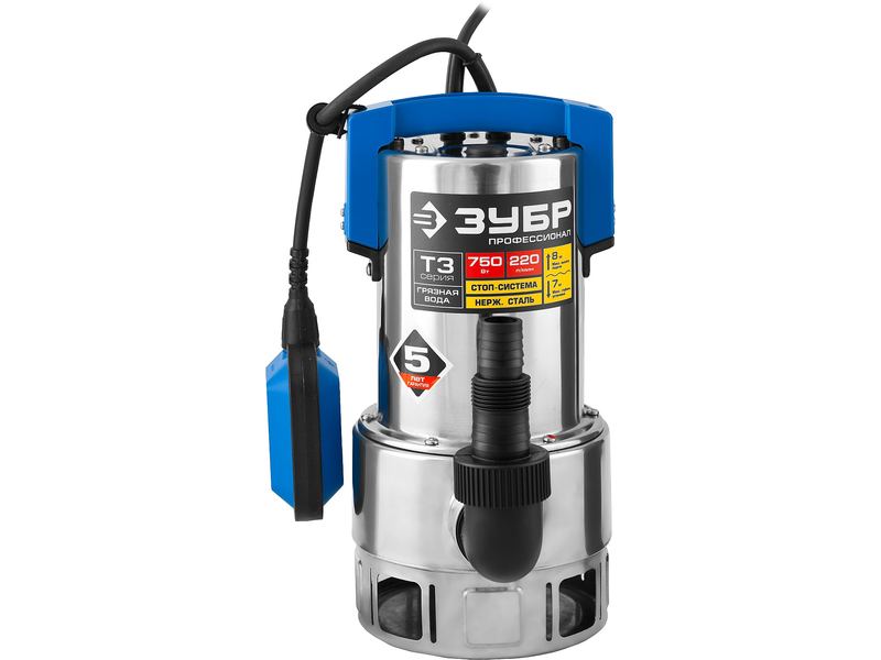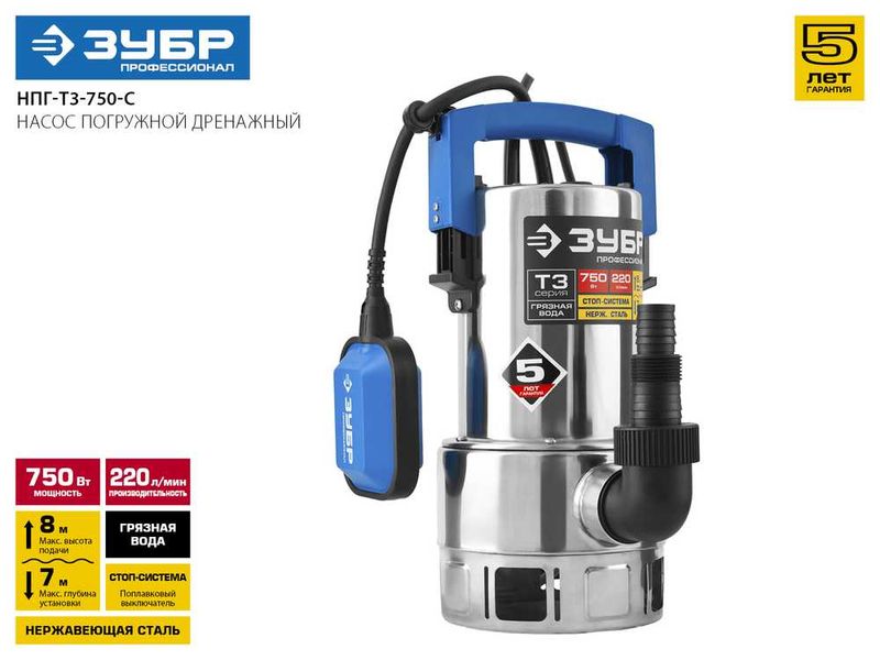 Насос ЗУБР ПРОФЕССИОНАЛ Т3 погружной дренажный для грязной воды (d частиц до 35мм), 750Вт, пропуск способн 220л/мин, напор 8,0м, нерж сталь,поплавок