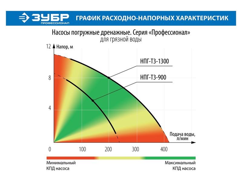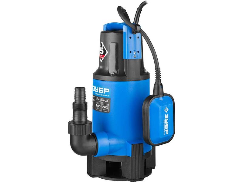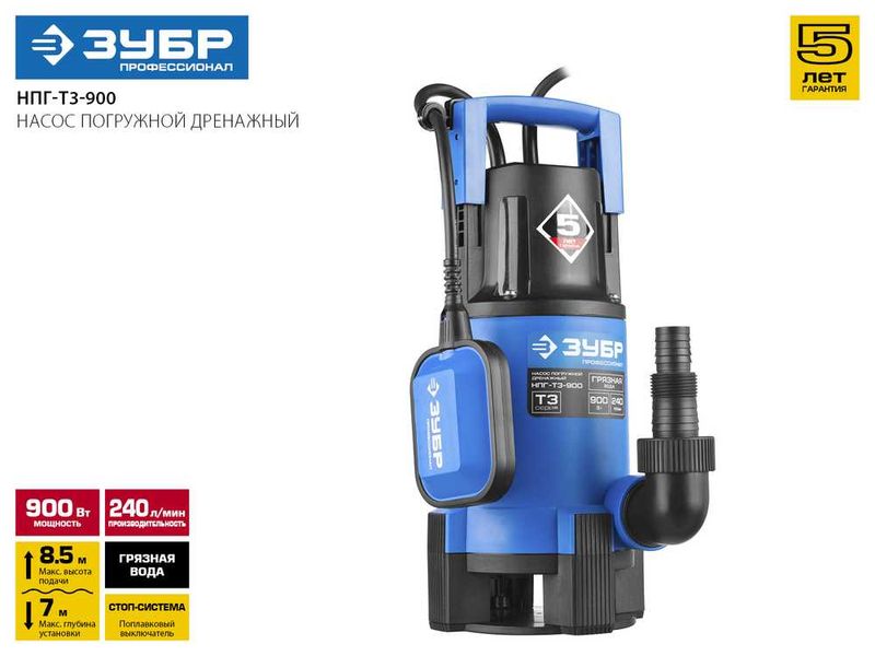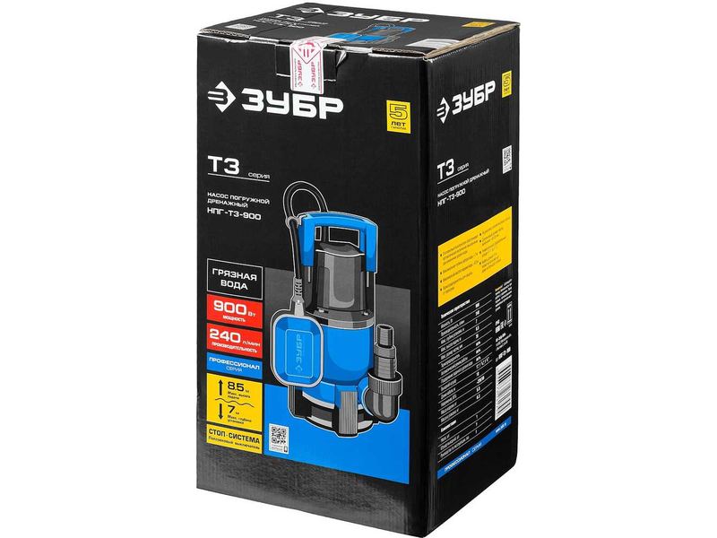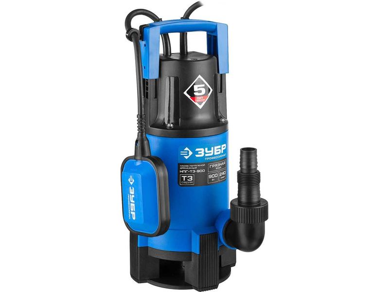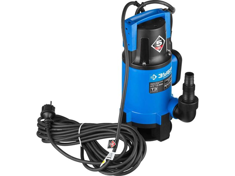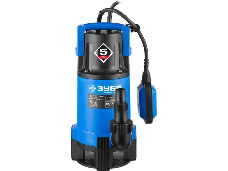 Насос ЗУБР ПРОФЕССИОНАЛ Т3 погружной дренажный для грязной воды (d пропуск частиц до 35мм), 900Вт, пропуск способн 240л/мин, напор 8,5м, поплавок