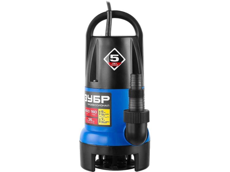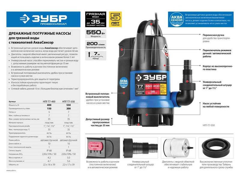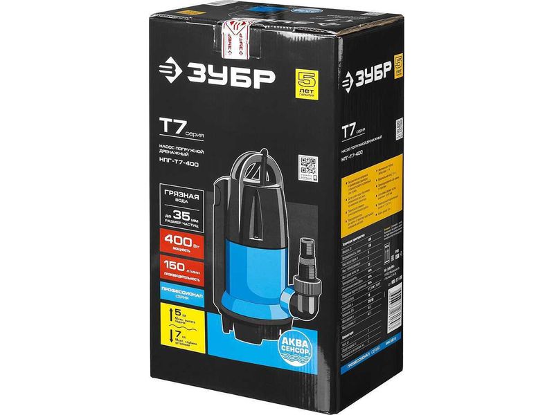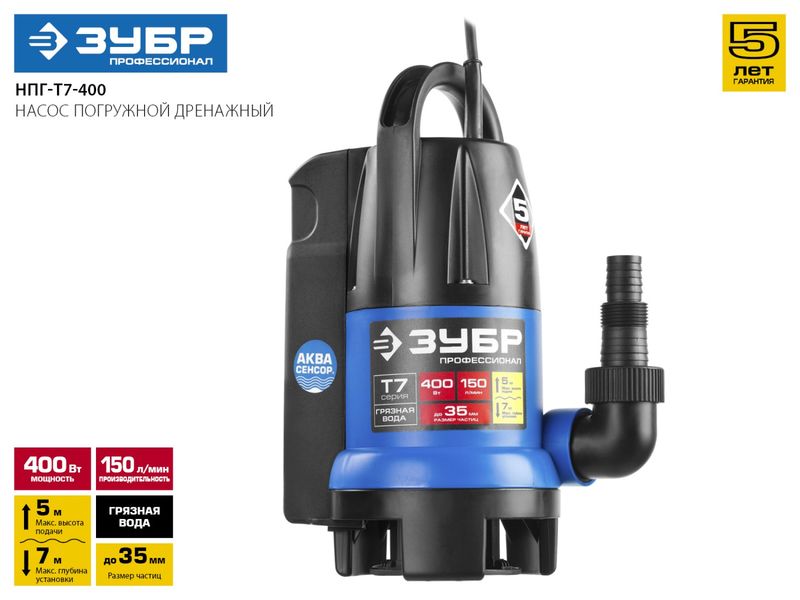 Насос ЗУБР ПРОФЕССИОНАЛ Т7 АкваСенсор погружной дренажный для грязной воды(d частиц до 35мм),400Вт,датчик уровня,пропуск способн 150л/мин,напор 5,0м