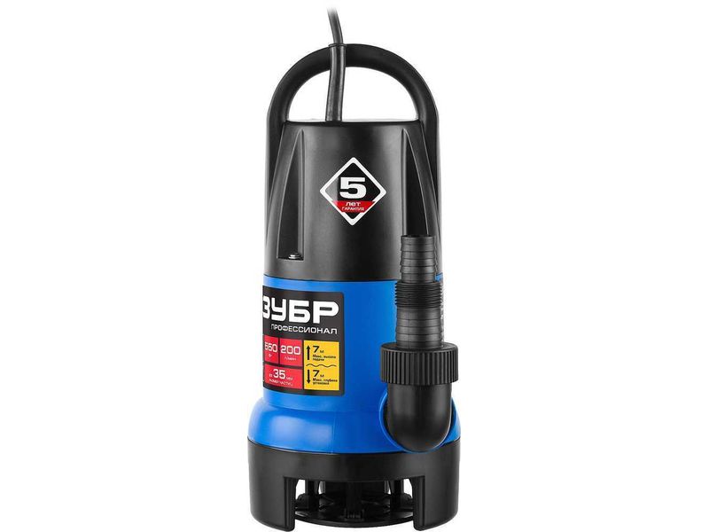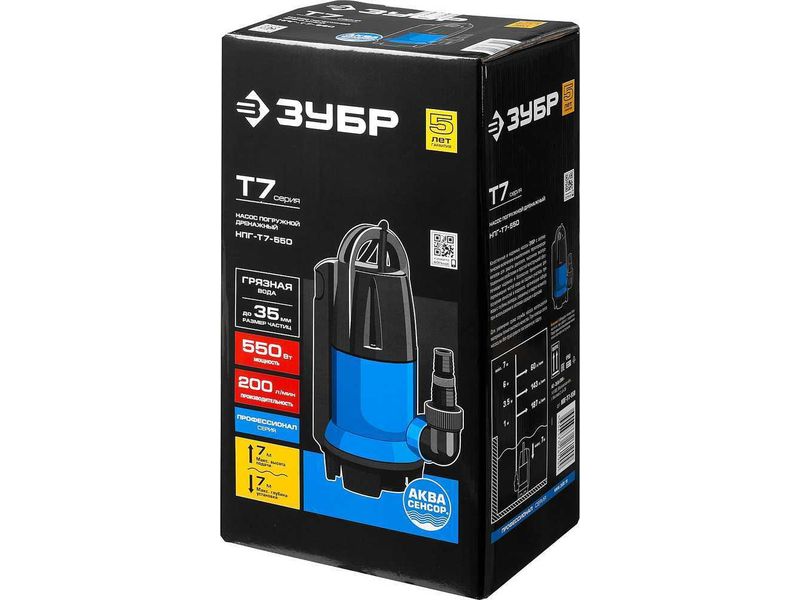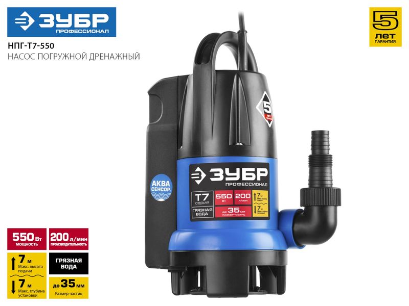 Насос ЗУБР ПРОФЕССИОНАЛ Т7 АкваСенсор погружной дренажный для грязной воды(d частиц до 35мм),550Вт,датчик уровня,пропуск способн 200л/мин,напор 7,0м