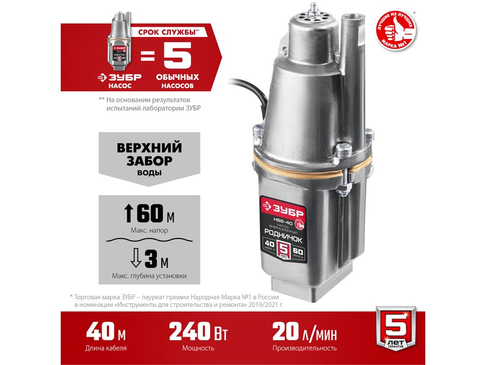 Купить ЗУБР Родничок-В, 40 м провод, насос вибрационный с верхним забором воды