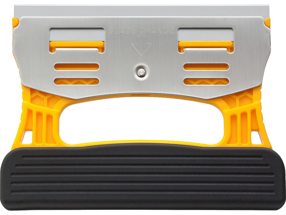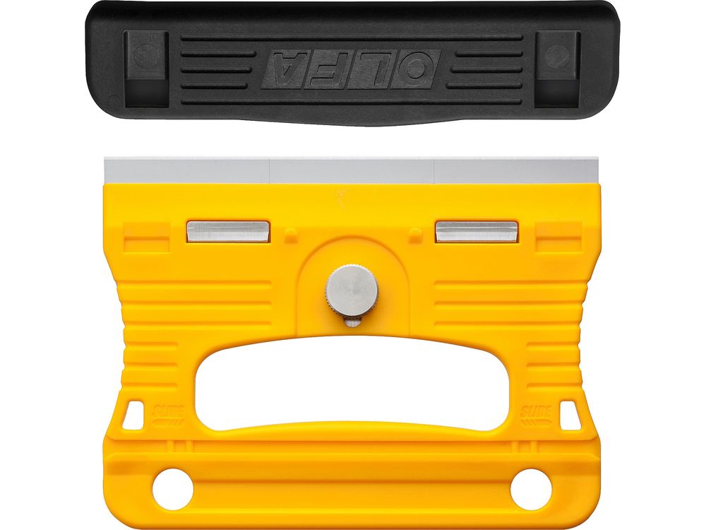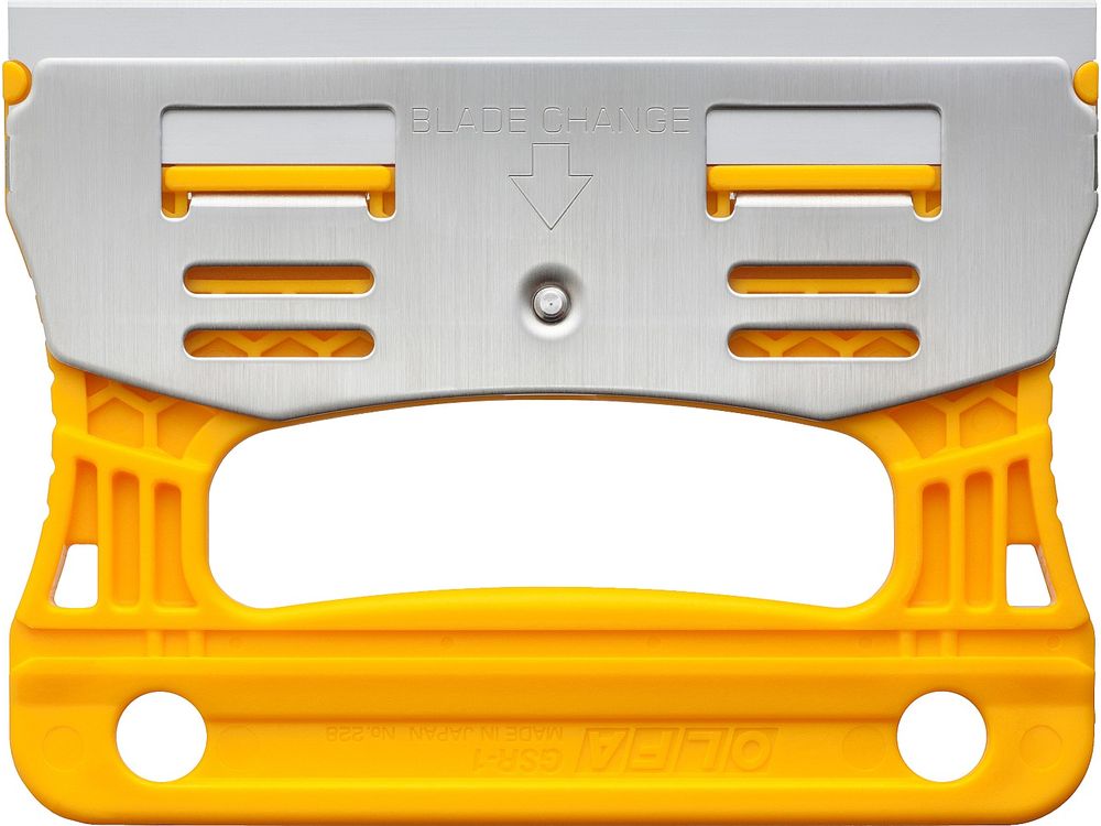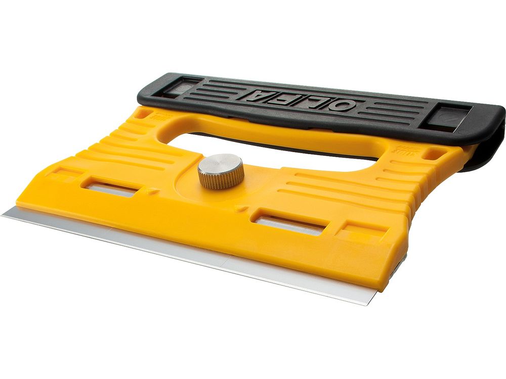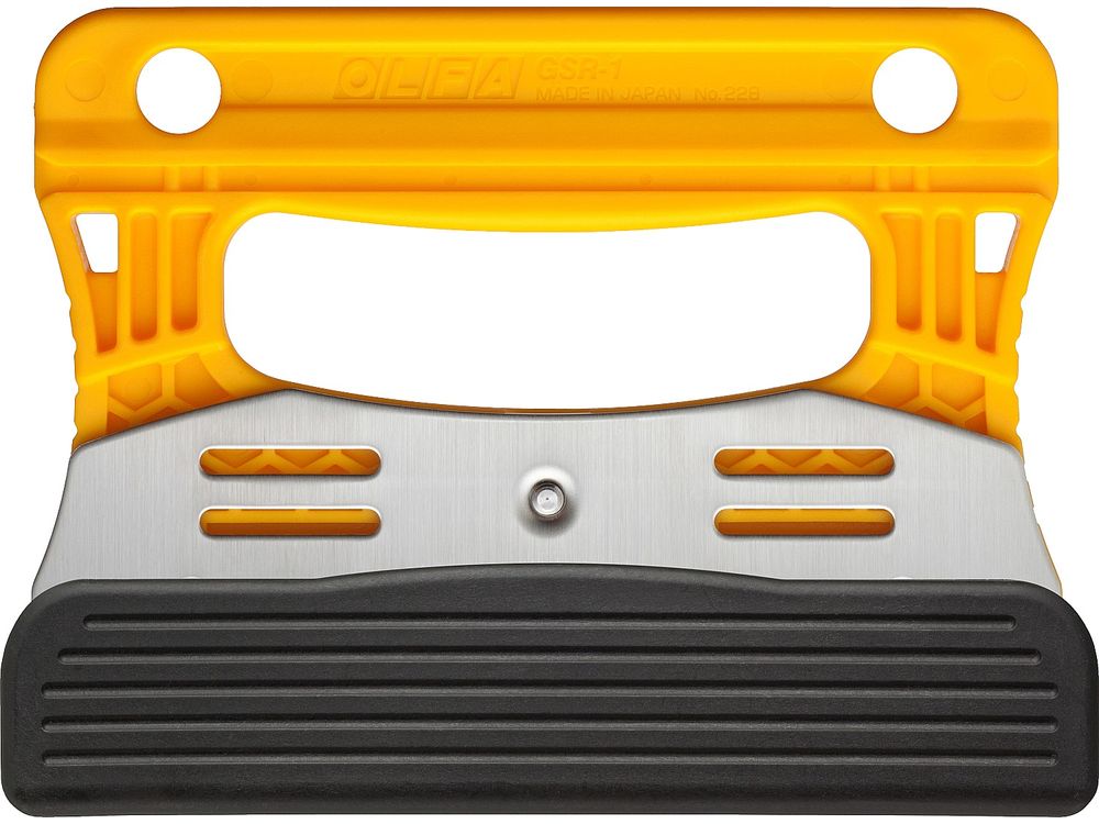 Тонкая конструкция скребка OLFA GSR-1 позволяет наклонять скребок максимально к плоской стеклянной поверхности. Рукоятка и защитная крышка лезвия изготовлены из усиленного фибергласом пластика который известен своей прочностью, жесткостью и устойчивостью к ацетону. Не только лезвие, но и пластина, удерживающая лезвие, и винт изготовлены из нержавеющей стали, поэтому скребок для стекла идеально подходит для работы с водой и жидкостью для мытья посуды.