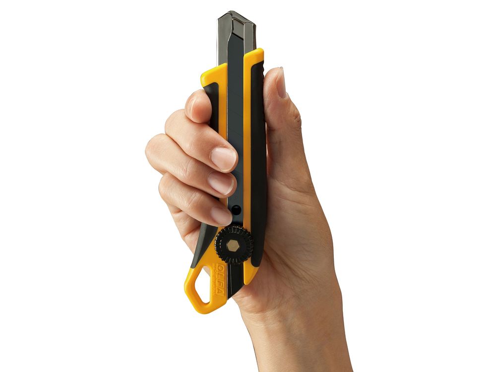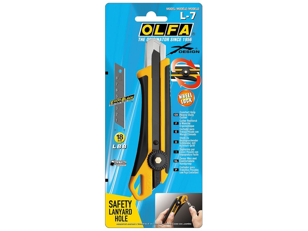 Универсальный нож OLFA L-7 серии X-design ComfortGrip с храповым механизмом и металлическим выступом. Легкий и простой в использовании оснащен эргономичной противоскользящей рукояткой устойчивой к кислотам, ацетону и маслам, усиленной фиберглассом. Эта комбинация обеспечивает удобный, надежный захват при выполнении самых сложных работ. Поставляется с черным лезвием LBB шириной 18 мм, которое на 25% острее стандартных лезвий OLFA. Просто отломите один из восьми сегментов, если лезвие затупилось. Полная замена происходит быстро и без дополнительных инструментов.