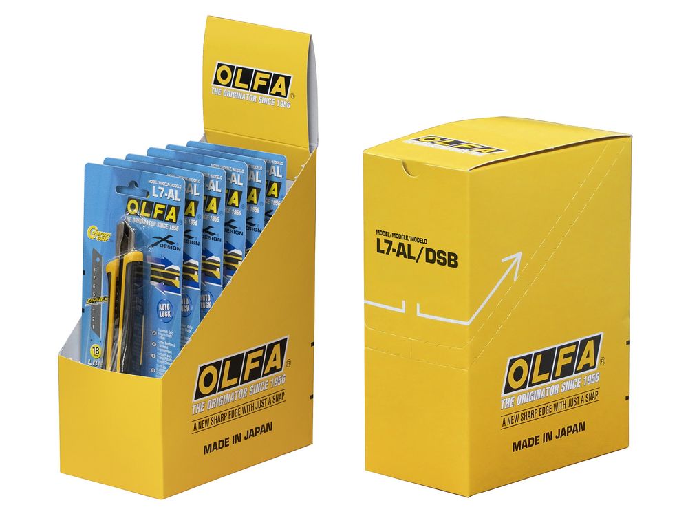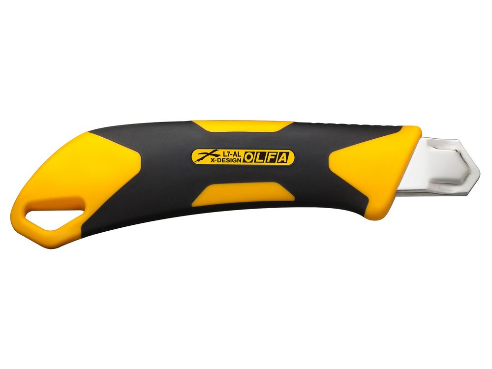 Универсальный нож OLFA L7-AL серии X-design ComfortGrip, с храповым механизмом и металлическим выступом. Легкий и простой в использовании оснащен эргономичной противоскользящей рукояткой устойчивой к кислотам, ацетону и маслам, усиленной фиберглассом. Эта комбинация обеспечивает удобный, надежный захват при выполнении самых сложных работ. Поставляется с черным лезвием LBB шириной 18 мм, которое на 25% острее стандартных лезвий OLFA. Просто отломите один из восьми сегментов, если лезвие затупилось. Полная замена происходит быстро и без дополнительных инструментов.