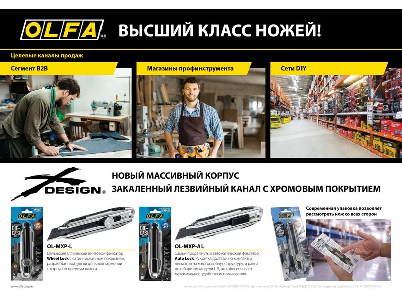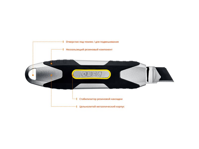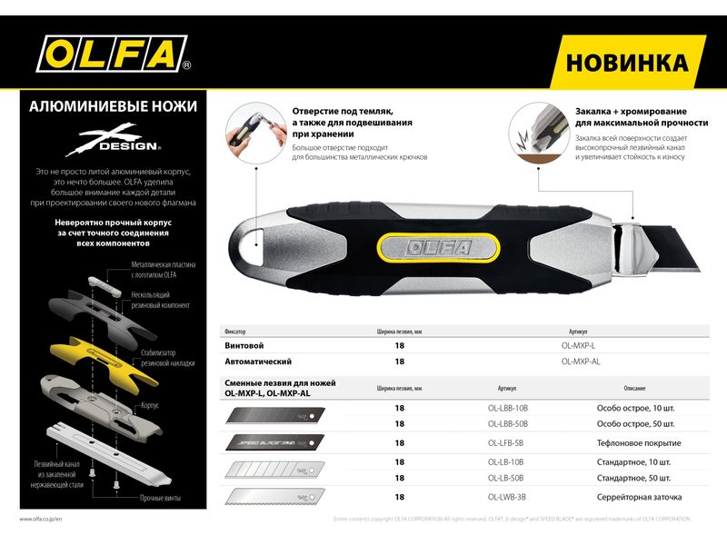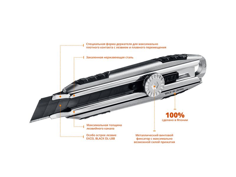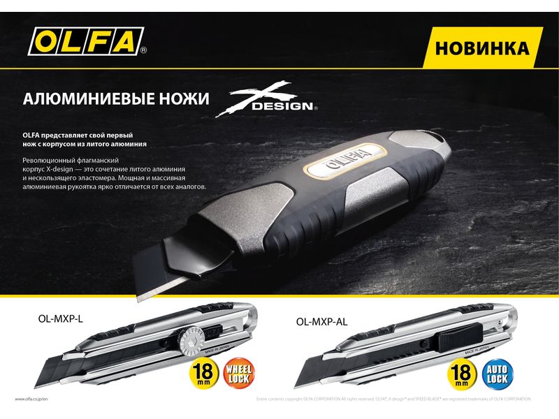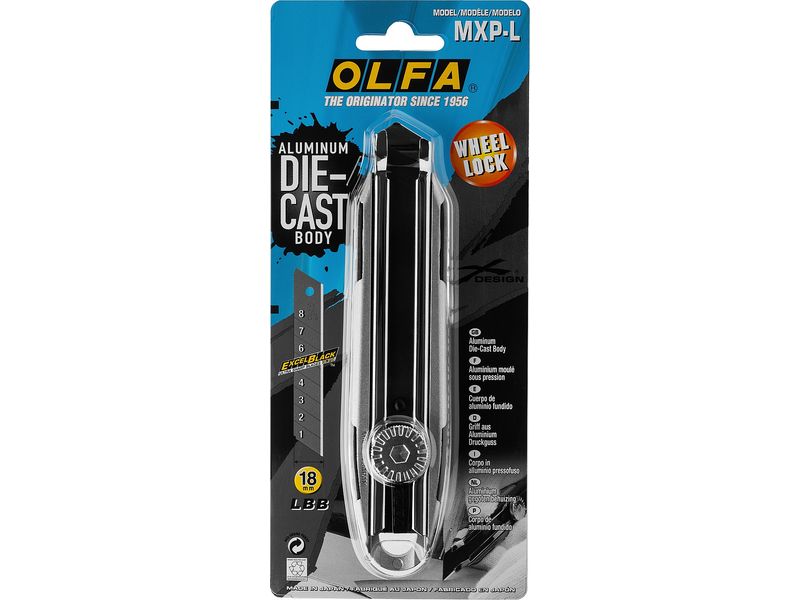 Нож из литого алюминия OLFA MXP-L для точного и уверенного реза. Корпус из нержавеющей стали надежно фиксирует лезвие, обеспечивая исключительную долговечность даже при непрерывном использовании. Ультра-острое черное сегментированное лезвие LBB шириной 18 мм на 25% острее стандартных лезвий OLFA, что делает этот универсальный нож выбором профессионалов.