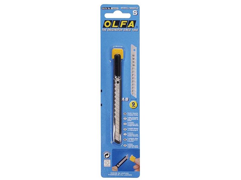 Компактный нож OLFA S с пластмассовой съемной клипсой. Металлический корпус инструмента обеспечивает надежность и длительный срок службы.