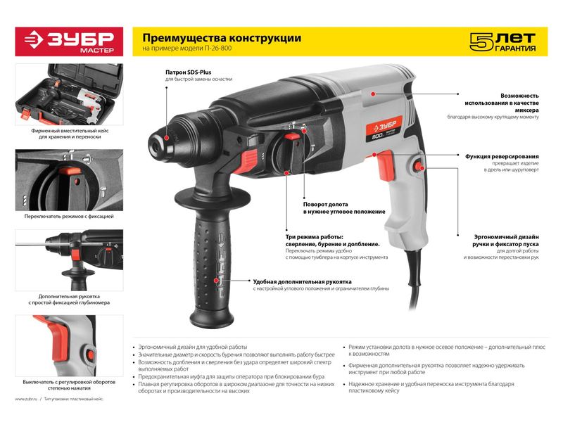 Инструмент для быстрого и производительного бурения и долбления бетона, а также сверления отверстий в металле и дереве. Универсальный инструмент для домашнего использования с возможностью выполнения отверстий до 22 мм