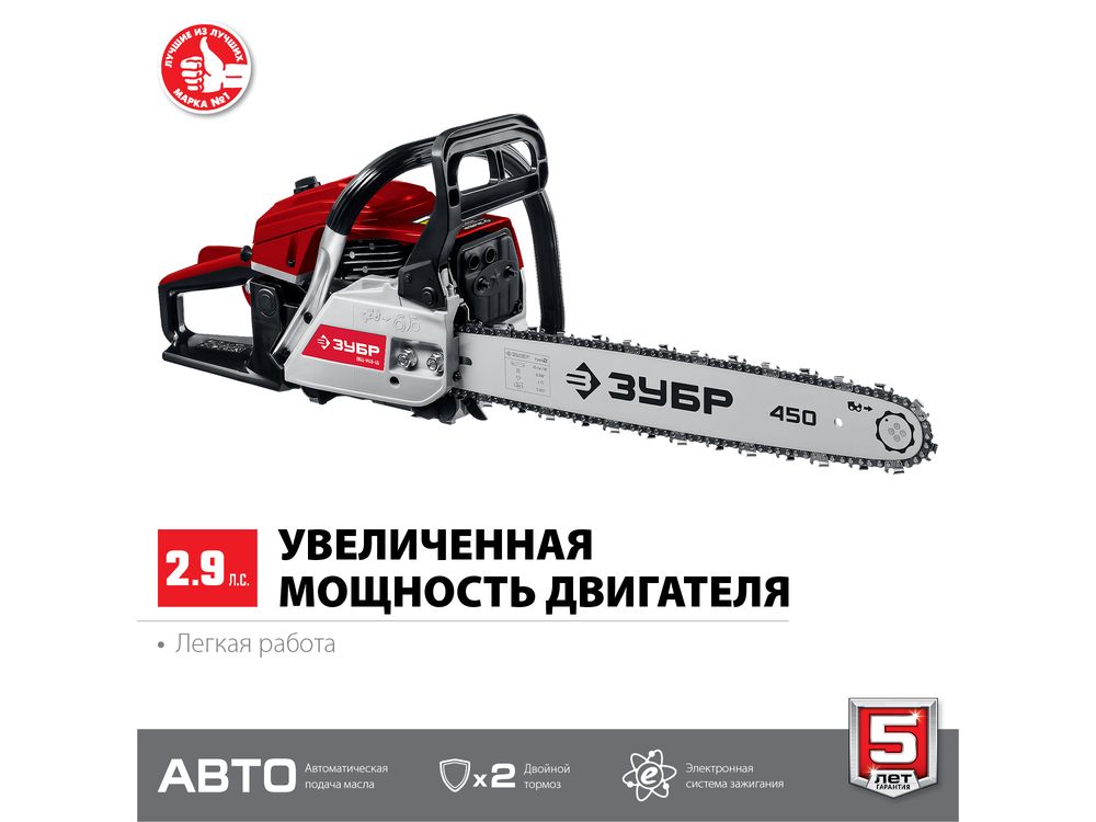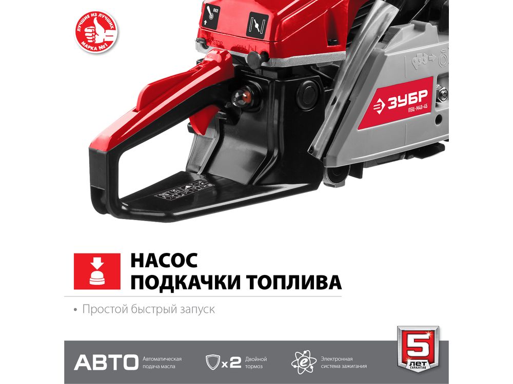 Идеальный вариант для пиления досок, бруса, стволов различных пород дерева на дачном участке. В отличие от электрической, бензиновая пила оснащена более мощным двигателем, безопасна в отношении поражения электрическим током, может работать в любую погоду и в любом месте. Функции легкого запуска, автоматической смазки цепи и эффективная антивибрационная защита делают пилу легкой в обращении и комфортной в работе. Двойной тормоз цепи, приводимый в действие при откидывании защитного щитка или при отпускании клавиши блокировки на рукоятке, а также встроенный цепеуловитель и металлический упор делают пилу безопасной в применении. Большая удельная мощность, высокое качество применяемых материалов и изготовления, обеспечивающие увеличенный ресурс, делают бензиновую пилу ЗУБР Вашим лучшим помощником. Обратите внимание, что рекомендуемая пильная гарнитура ЗУБР устанавливается только комплектом