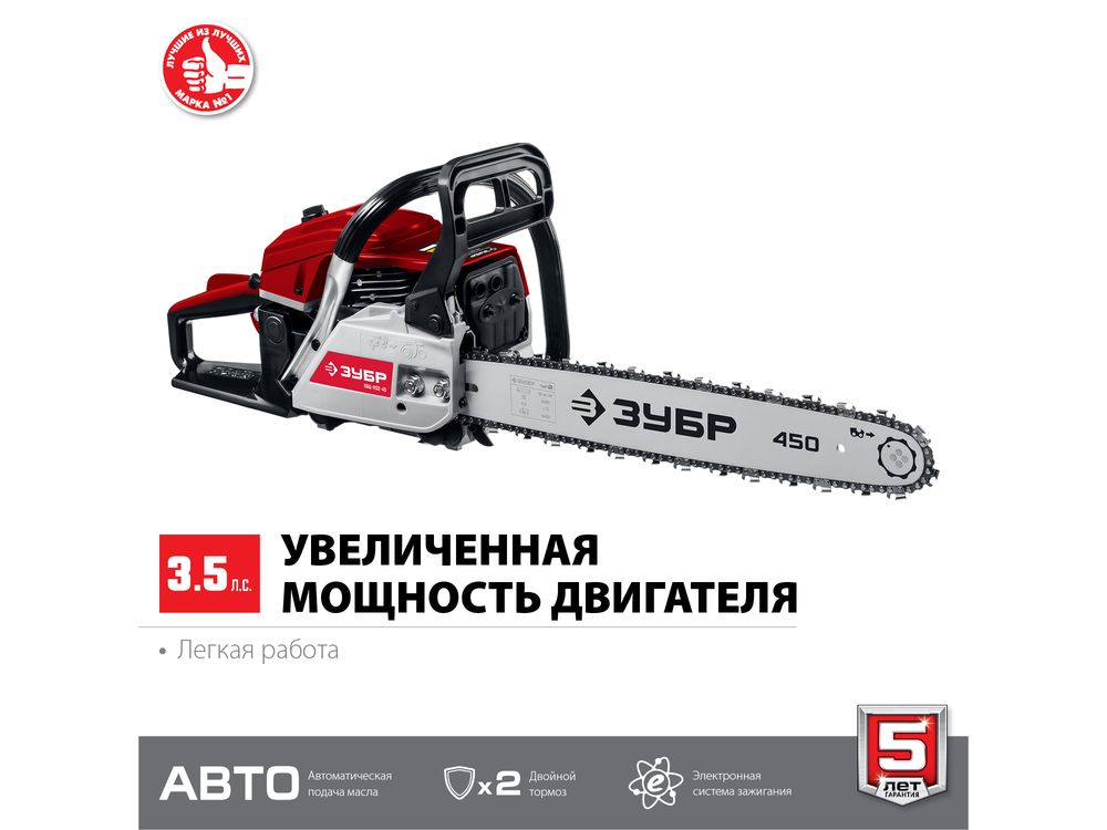 Идеальный вариант для пиления досок, бруса, стволов различных пород дерева на дачном участке. В отличие от электрической, бензиновая пила оснащена более мощным двигателем, безопасна в отношении поражения электрическим током, может работать в любую погоду и в любом месте. Функции легкого запуска, автоматической смазки цепи и эффективная антивибрационная защита делают пилу легкой в обращении и комфортной в работе. Двойной тормоз цепи, приводимый в действие при откидывании защитного щитка или при отпускании клавиши блокировки на рукоятке, а также встроенный цепеуловитель и металлический упор делают пилу безопасной в применении. Большая удельная мощность, высокое качество применяемых материалов и изготовления, обеспечивающие увеличенный ресурс, делают бензиновую пилу ЗУБР Вашим лучшим помощником. Обратите внимание, что рекомендуемая пильная гарнитура ЗУБР устанавливается только комплектом
