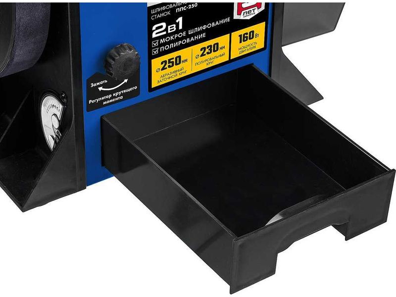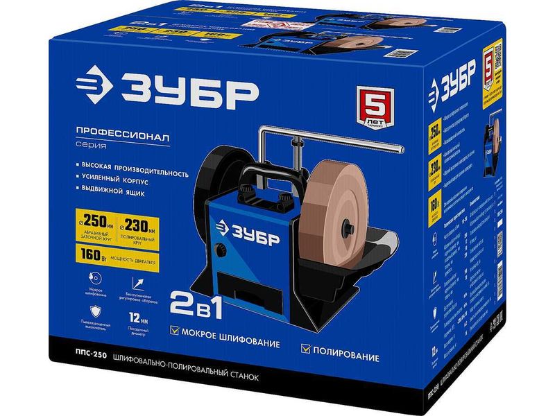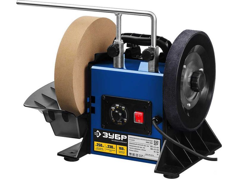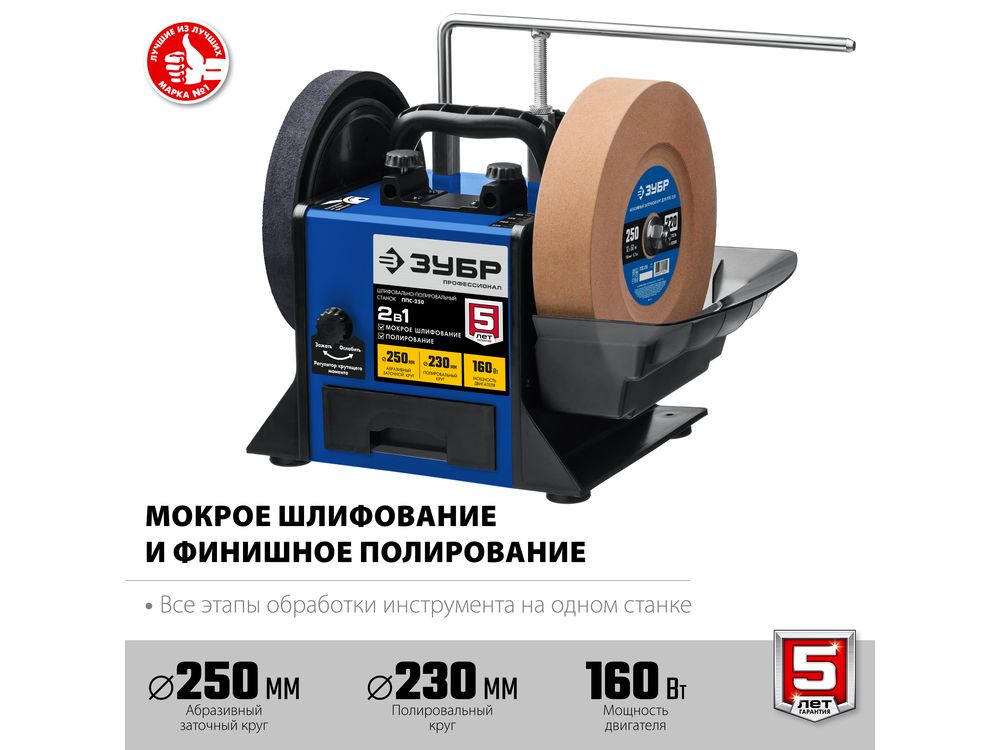 Шлифовально-полировальный станок ЗУБР ППС-250 - выбор настоящего профессионала. Простая конструкция, водяное охлаждение точильного круга, полировальный круг, бесступенчатая регулировка оборотов, пылезащищенный выключатель, рукоятка для переноски - то качество и долговечность которые ищет любой профессионал.