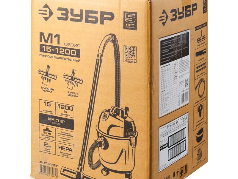 Пылесос ЗУБР "МАСТЕР" хозяйственный, модель М1-15, 15л, 1200Вт, сухая и влажная уборка