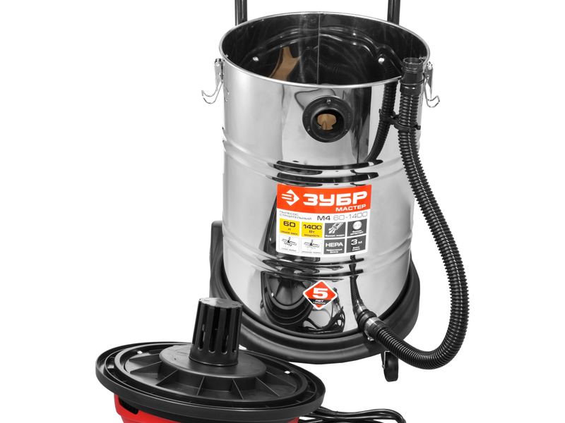 Пылесос ЗУБР "МАСТЕР" строительный, модель М3-60, 60л, 1400Вт, сухая и влажная уборка, корпус из нержавеющей стали, розетка до 2000Вт