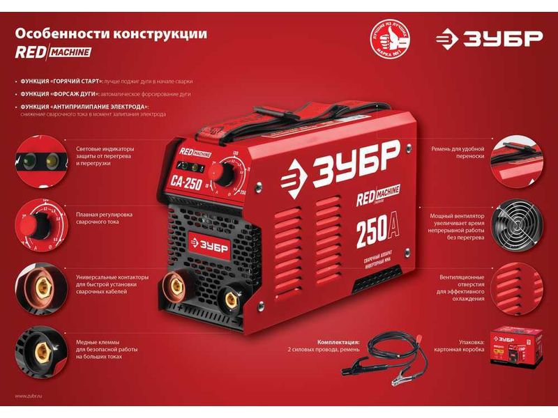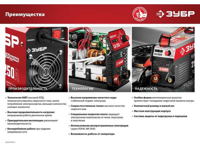 Мощный сварочный аппарат предназначен для ручной электродуговой сварки с применением плавких электродов (ММА). Электронные компоненты и микропроцессорное управление сварочным током обеспечивают малые вес и габариты, стабильность характеристик и оперативное подстраивание к любым условиям процесса сварки: реализация защит, облегчение зажигания дуги, возможность сварки различных материалов различными электродами и т.д. ЗУБР - передовые технологии у Вас на службе