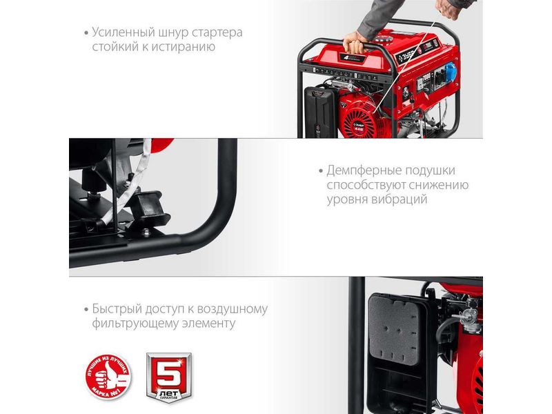 Мощный генератор, который пригодится не только в загородном доме, но и в мастерской, и на строительной площадке, и вообще везде, где нет стационарного электричества, но нужно иметь работающую технику и инструмент. Высокое качество выходной энергии позволяет запитывать даже требовательную электронную технику. Электрический стартер облегчает запуск, особенно в зимнее время. Дополнительная розетка увеличенной мощности для подключения таких потребителей, как нагреватели, калориферы, осветительная техника или несколько потребителей одновременно. Аккумуляторная батарея не входит в комплект поставки. Емкость батареи не менее 14 А*ч.