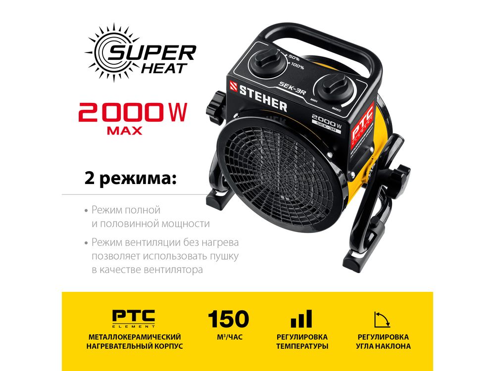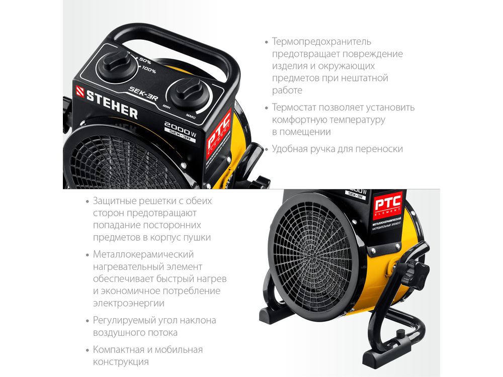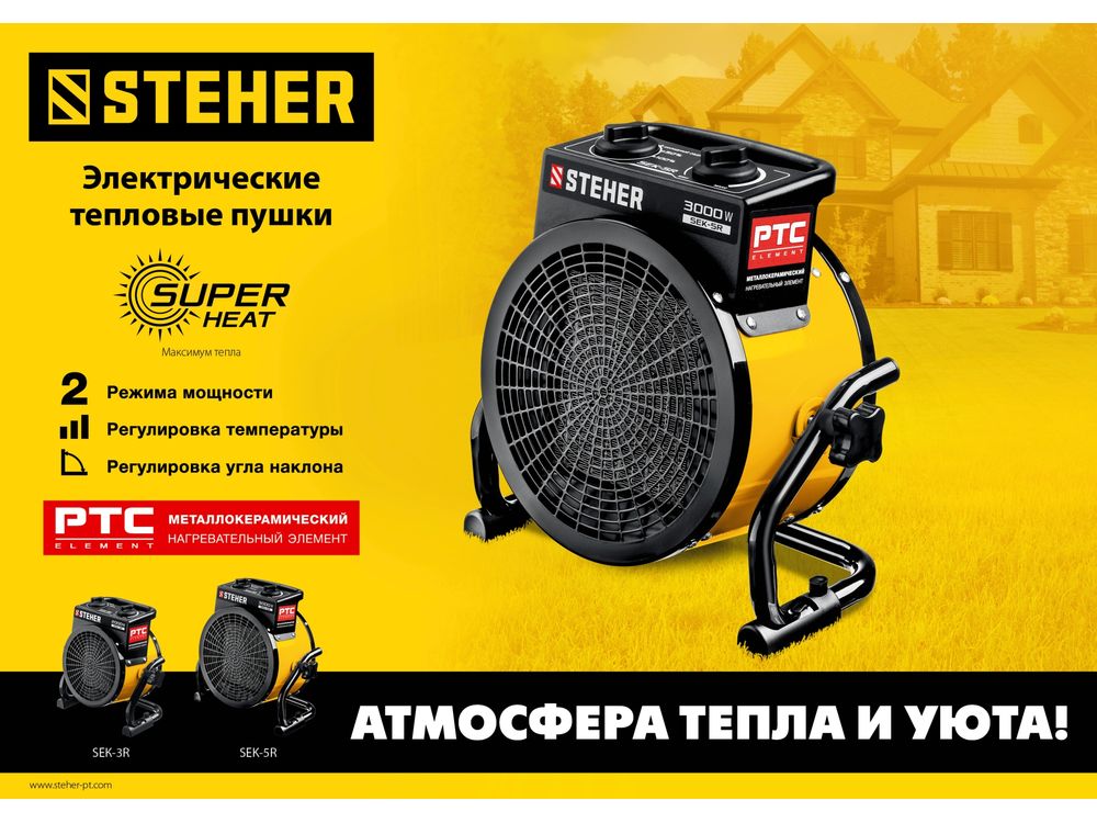 Электрические тепловые пушки STEHER серии SEK – компактные пушки в круглом корпусе для обогрева небольших помещений. Благодаря небольшим размерам тепловую пушку легко переносить и хранить. Устройства оснащены долговечным металлокерамическим нагревательный элементом,обеспечивающий быстрый равномерный нагрев, экономное потребление электроэнеергии и не сушит воздух. Механический терморегулятор поддерживает нужную температуру нагрева.За счет большой площади теплообмена и небольшой температуры нагрева элемента, воздух быстро прогревается. Изделие можно оставлять на долгое время и не бояться за сохранность помещения, так как конструктивные меры безопасности защищают Вас и изделие при нештатных ситуациях.