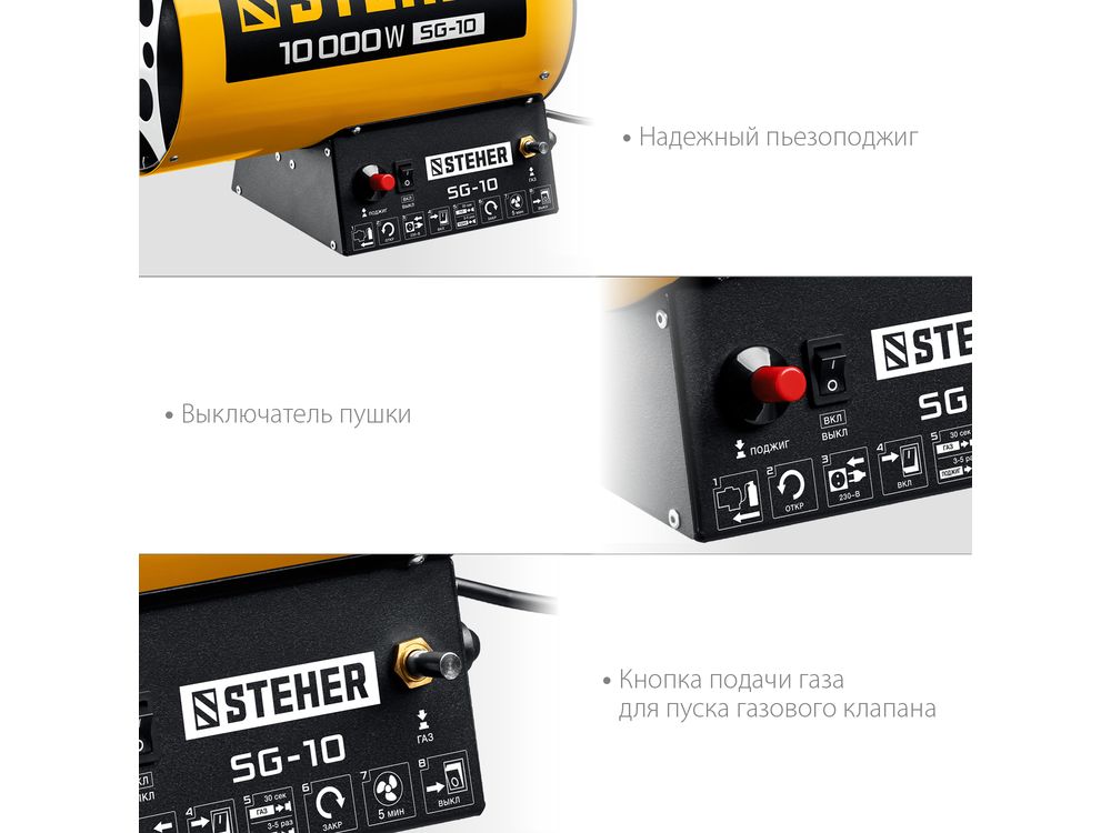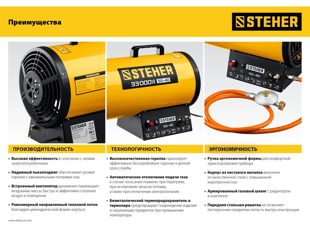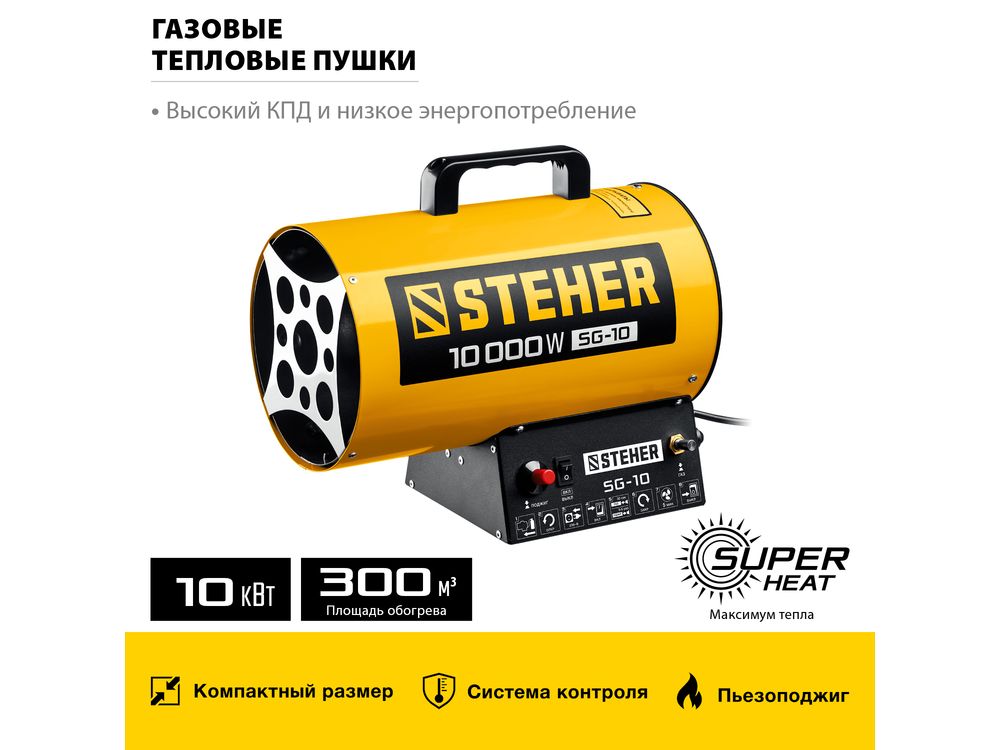 Газовые тепловые пушки STEHER - мощные теплогенераторы, работающие наиболее распространенном виде топлива. Компактный корпус, контроль наличия пламени, биметаллический термопредохранитель и двойное теплоэкранирование. Оптимальное решение для прогрева складских и производственных помещений.