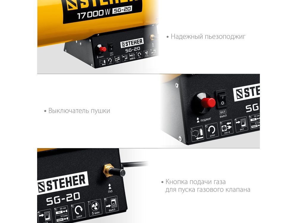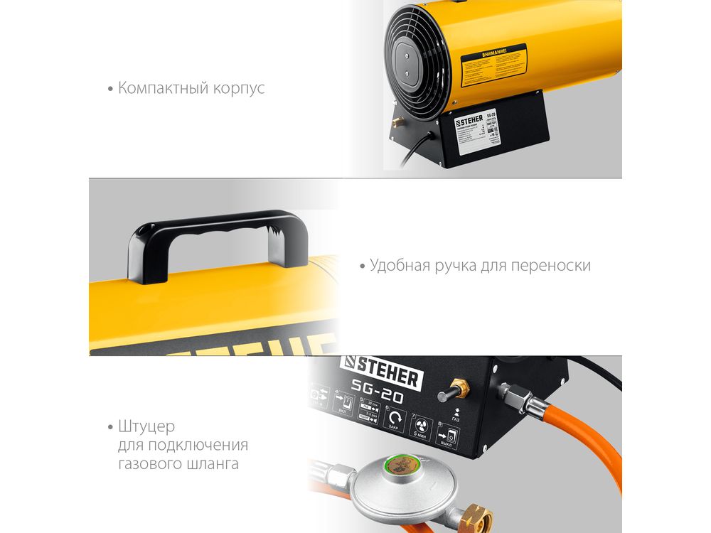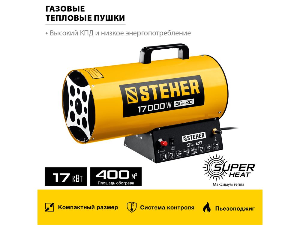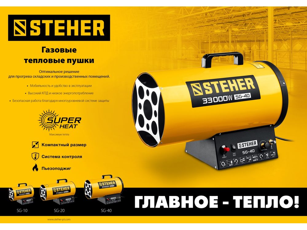 Газовые тепловые пушки STEHER - мощные теплогенераторы, работающие наиболее распространенном виде топлива. Компактный корпус, контроль наличия пламени, биметаллический термопредохранитель и двойное теплоэкранирование. Оптимальное решение для прогрева складских и производственных помещений.