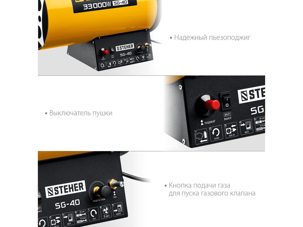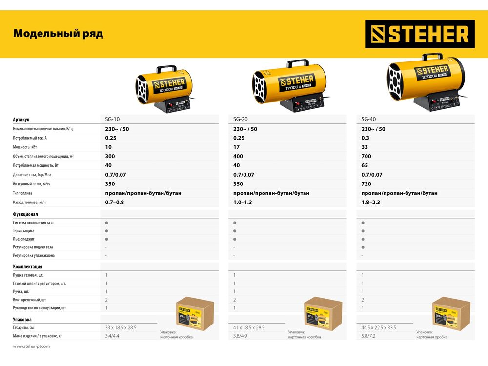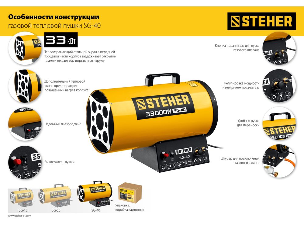 Газовые тепловые пушки STEHER - мощные теплогенераторы, работающие наиболее распространенном виде топлива. Компактный корпус, контроль наличия пламени, биметаллический термопредохранитель и двойное теплоэкранирование. Оптимальное решение для прогрева складских и производственных помещений.