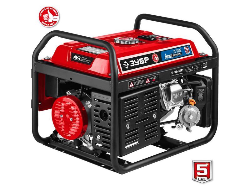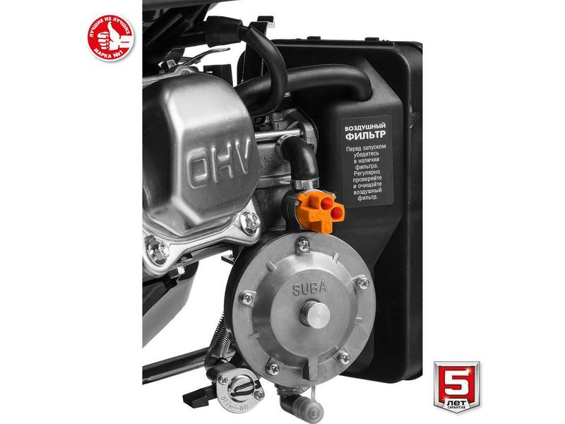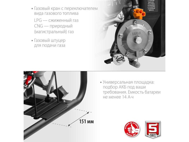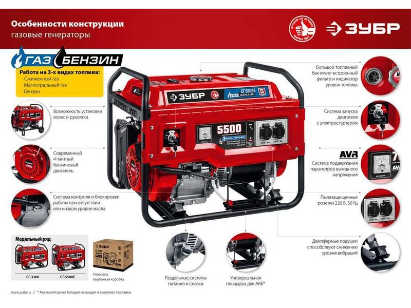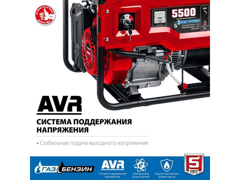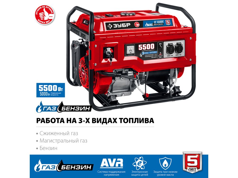 Мощный двухтопливный электрогенератор мощностью 5.5 кВт, работающих как на бензине (АИ-92), так и на газе – при этом, для использования газа не требуется установка дополнительного оборудования. Генератор этой модели используется в загородном доме, строительной площадке и дачном участке для питания бытовой техники, насосных станций и электронагревателей. Аккумуляторная батарея не входит в комплект поставки. Емкость батареи не менее 14 А*ч.