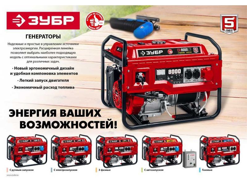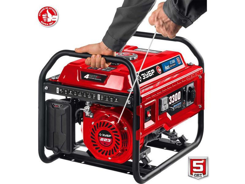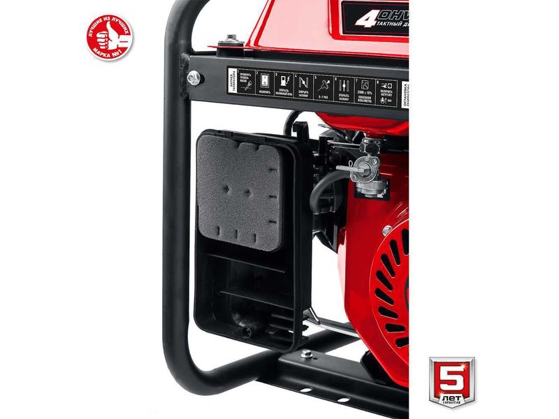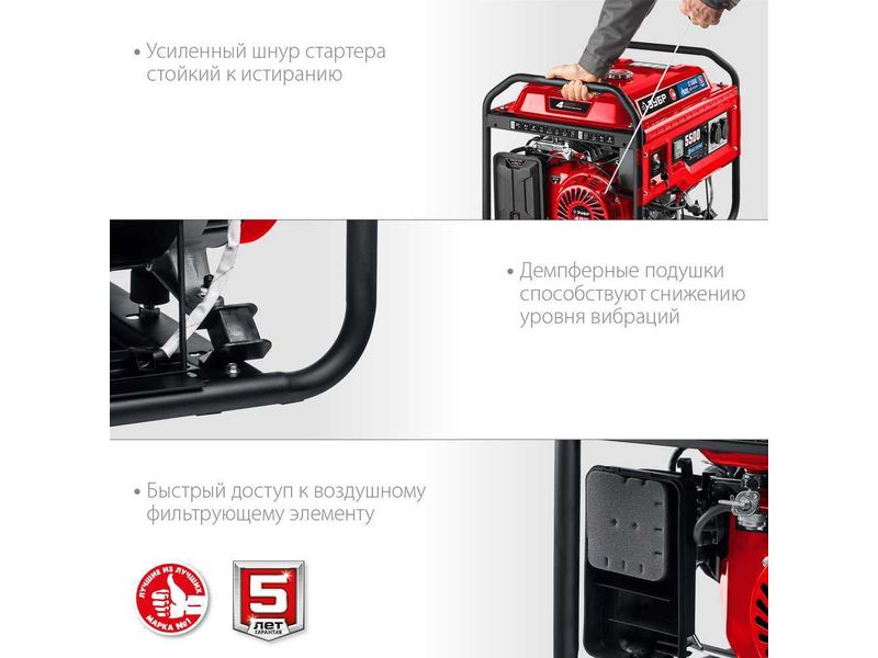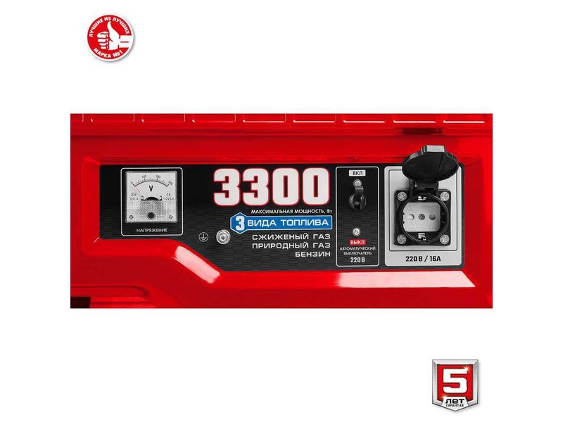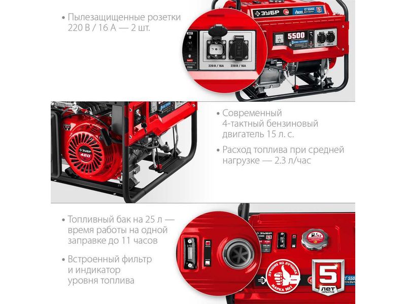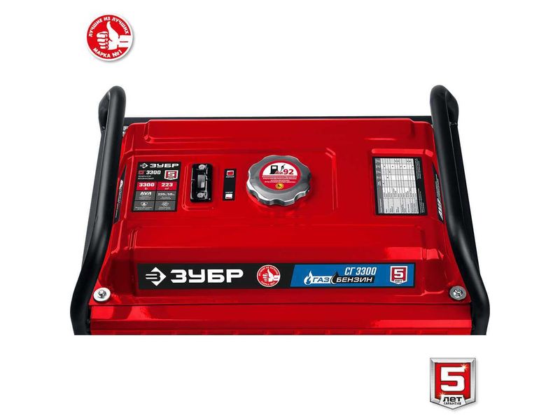 Мощный двухтопливный электрогенератор мощностью 5.5 кВт, работающих как на бензине (АИ-92), так и на газе – при этом, для использования газа не требуется установка дополнительного оборудования. Генератор этой модели используется в загородном доме, строительной площадке и дачном участке для питания бытовой техники, насосных станций и электронагревателей. Аккумуляторная батарея не входит в комплект поставки. Емкость батареи не менее 14 А*ч.