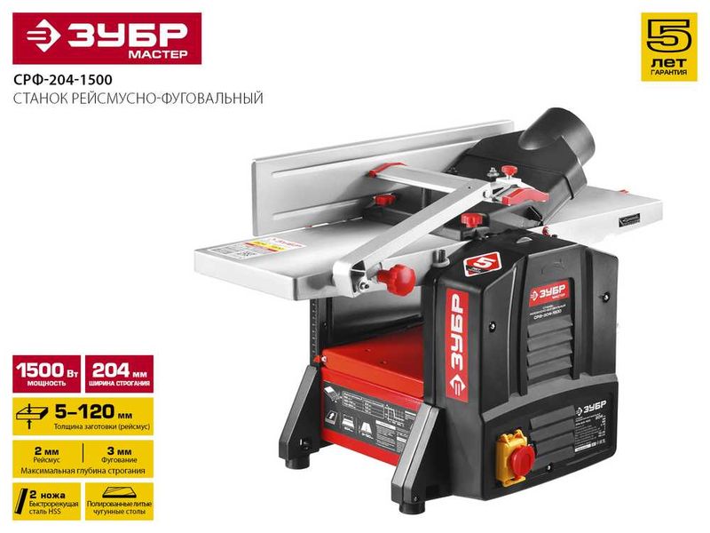 Станок ЗУБР "МАСТЕР" рейсмусно-фуговальный, ширина строгания 204мм, толщина заготовки до 120мм, 2 ножа, 8000 об/мин, 1500Вт