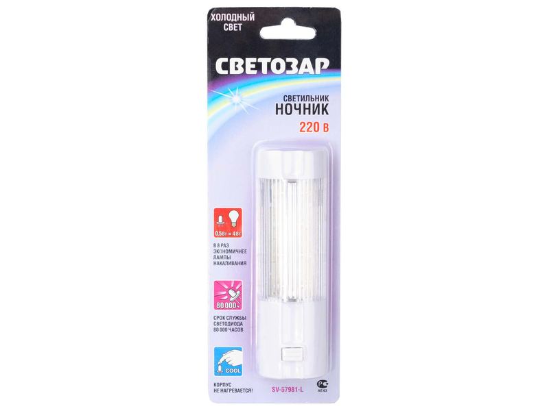 Светильник-ночник СВЕТОЗАР, 4 светодиода (LED), 220В SV-57981-L предназначены для освещения части помещения в ночное время. Он излучает белый свет (2700 К). Поток света, который даёт светильник, сопоставим с потоком света от лампы накаливания в 5 Вт.